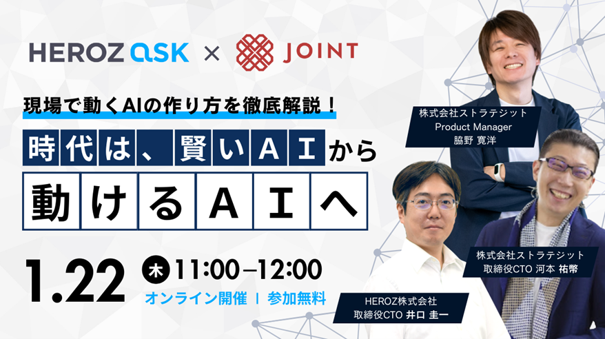 HEROZ株式会社(本社:東京都港区、代表取締役CEO:林 隆弘、以下「HEROZ」)は、グループ会社の株式会社ストラテジット(本社:東京都港区、代表取締役社長:加藤 史恵、以下「ストラテジット」)と共催で、生成AIを実務で「実行」までつなげるための設計・連携をテーマとした無料ウェビナー「賢いAIから、動けるAIへ ~HEROZ ASK×JOINTで実現する『現場で動くAI』の作り方~」を2025年1月22日(木)に開催いたします。
