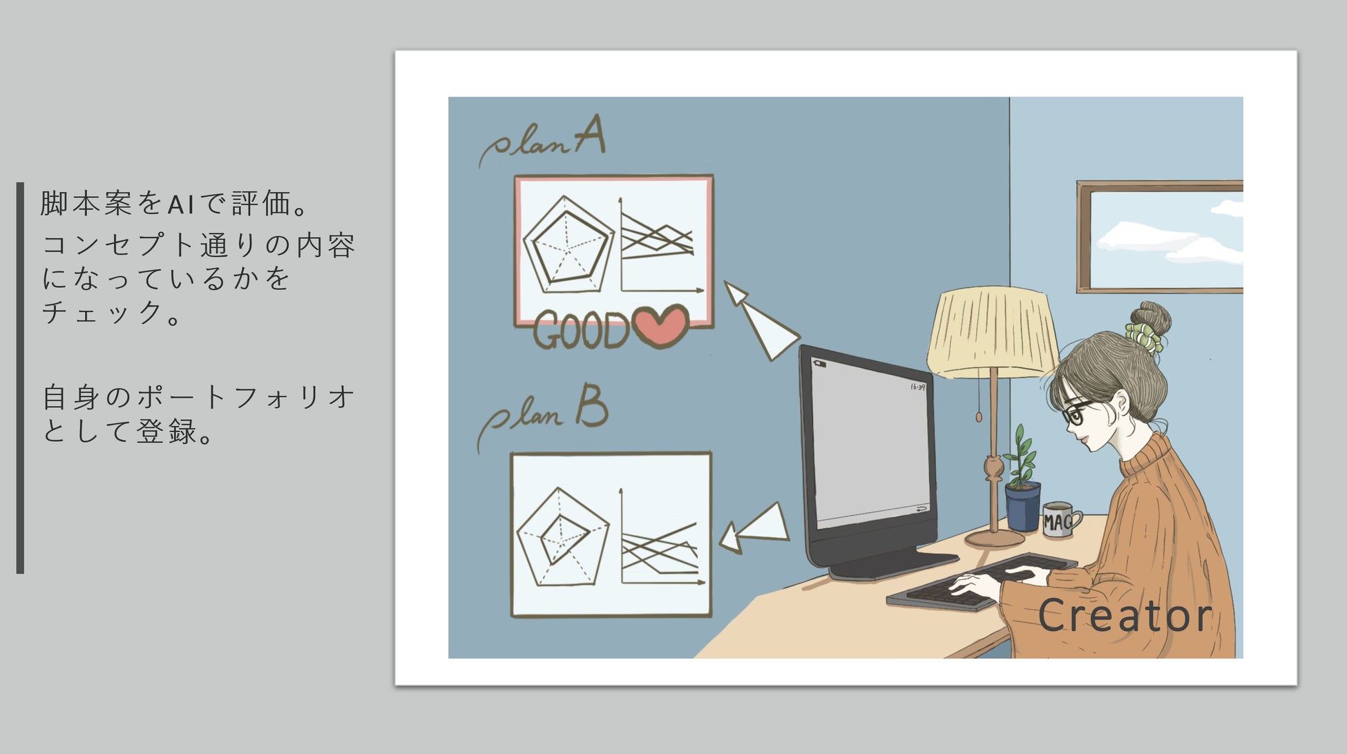 シーン1:クリエイター自身が複数の脚本案をAIで評価し、コンセプト通りの内容になっているかをチェック。より良いと思える案を自身のポートフォリオとして登録。
