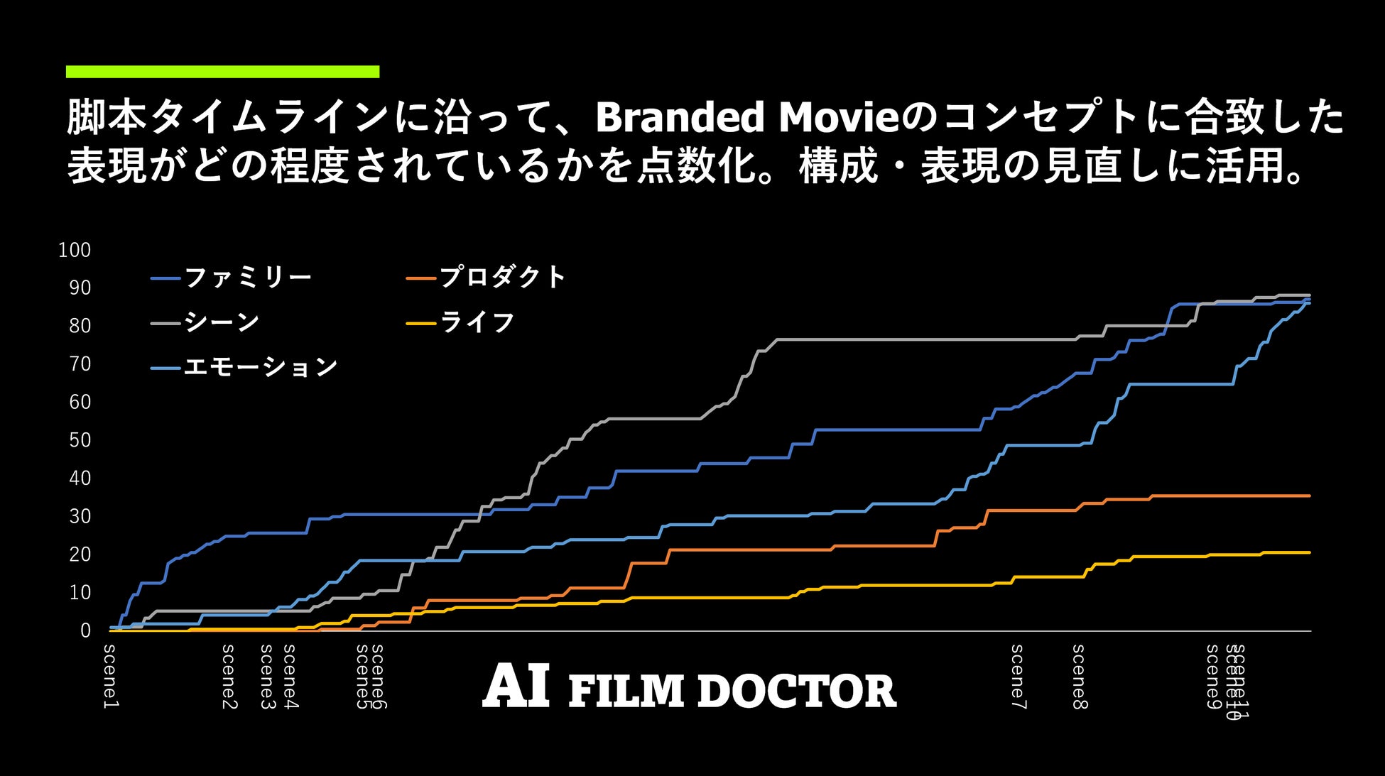 Branded Movieで届けたいコンセプトが脚本等で表現されているかを文章解析AIで評価・スコアリング(点数化)。脚本等のタイムラインに沿ってスコアリングすることでコンセプトに合った構成・表現への見直し・磨き上げが可能になります。