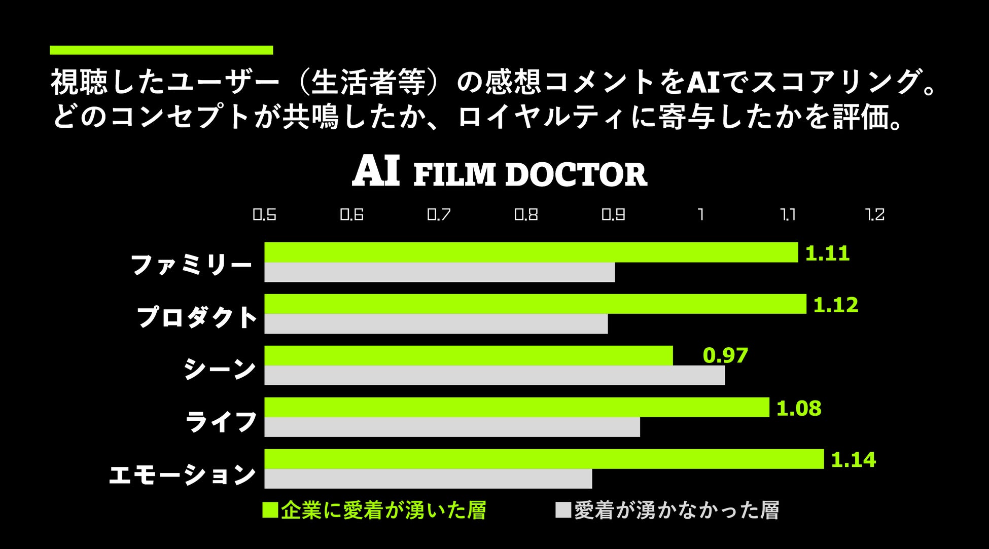 そこで今回、「AIフィルム・ドクター」を通じ、文章解析AIを活用して「コンセプト通りの構成・脚本等になっているのか」、「コンセプトがユーザー(生活者等)に響いたのか」を科学的に検証・アセスメントするサービスを開始することとなりました。