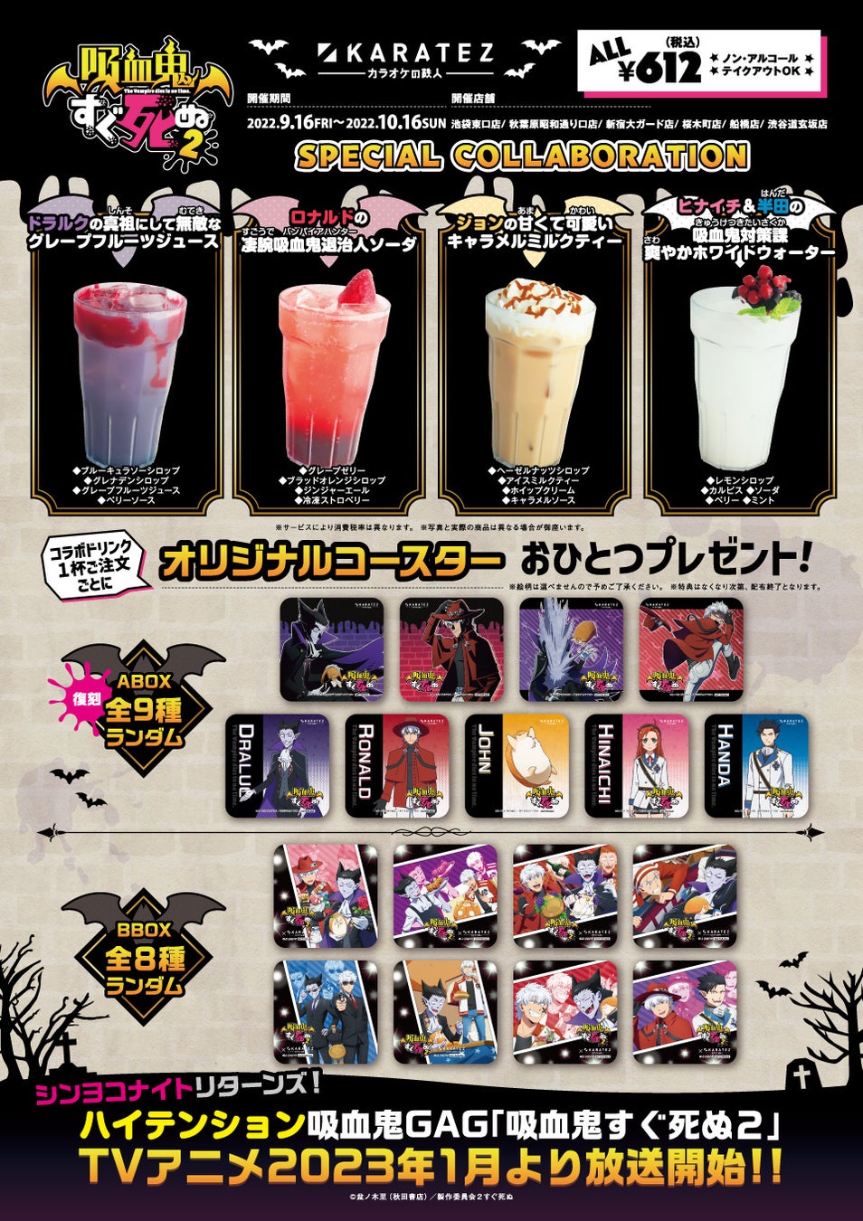 株式会社鉄人化計画(所在地:東京都目黒区、代表取締役社長:根来拓也)は、当社が運営する「カラオケの鉄人」の首都圏6店舗において、「週刊少年チャンピオン」(秋田書店)にて連載中の、盆ノ木至(ぼんのき いたる)原作によるTVアニメ『吸血鬼すぐ死ぬ』との第2弾コラボレーションキャンペーン(以下「コラボ」)を、2022年9月16日(金)より開催します。