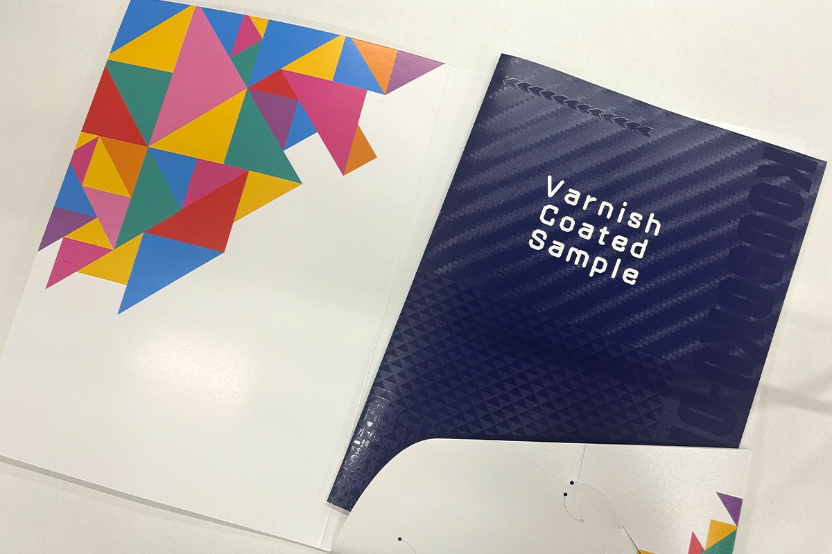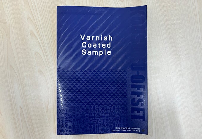 光沢のある浮き出したような文字や模様が表現できる加工。「エンボス加工」は紙を挟み込んでプレスすることにより凹凸を生み出しますが、「疑似エンボス加工」は表面に2種類のニス(ハジキニスと光沢ニス)を塗ることで、紙から模様が浮き出したような質感を再現します。