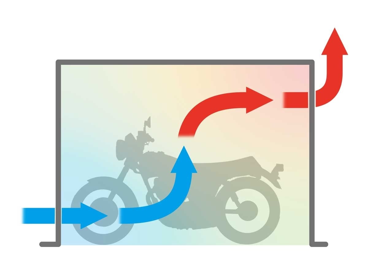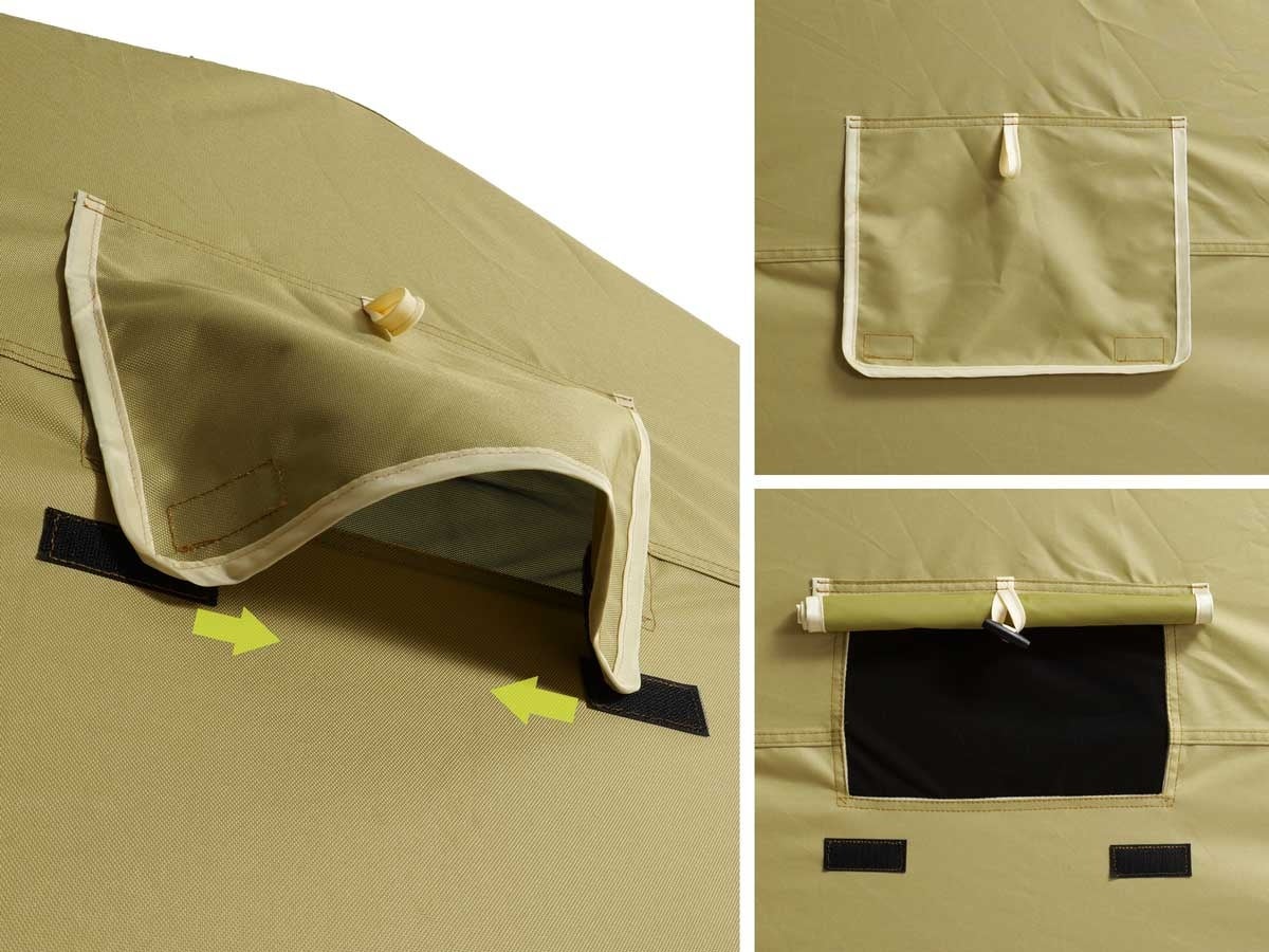 ■“重力換気”を可能にする高低差付きの換気口と、本体側に長めの面ファスナーを備えたフラップにより、雨の日でも下向きの開口を確保できます。