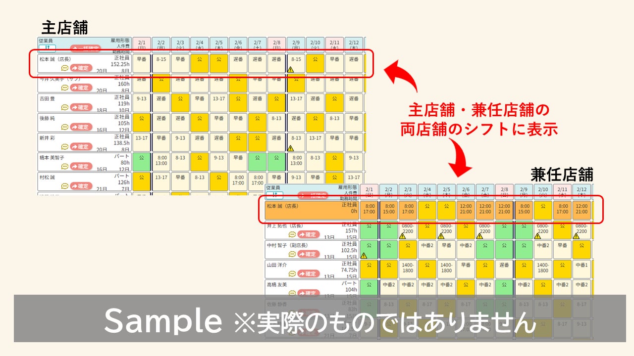 複数店舗で働く可能性のあるスタッフの勤務状況を、店舗をまたいで共有できる仕組みです。