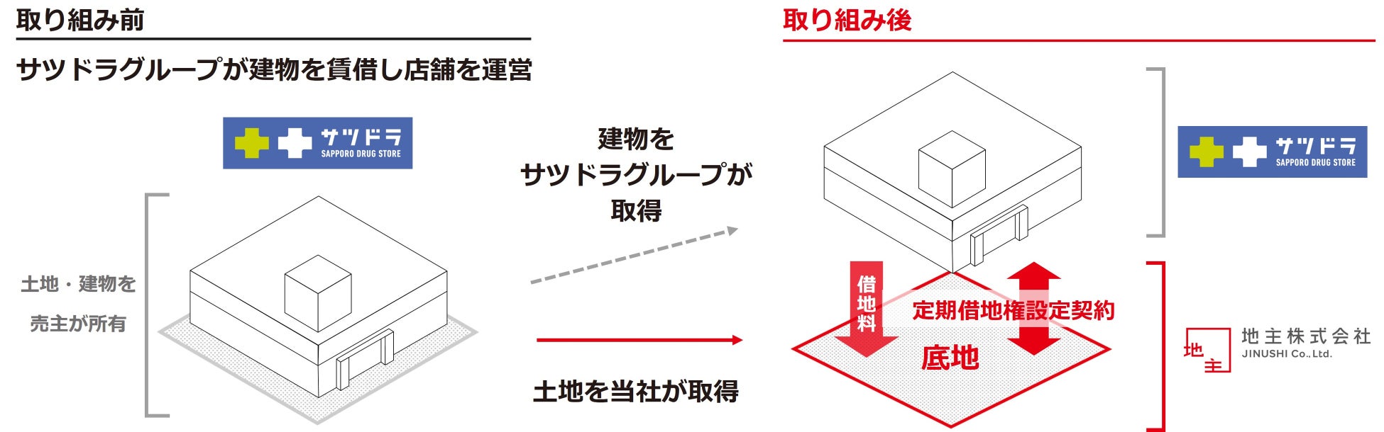 本件は、サツドラグループが運営する店舗について、同グループが建物を取得すると同時に、当社が土地を取得(取得総額20億円以上※1)し、定期借地権設定契約を締結する「JINUSHIリースバック」による取り組みです。