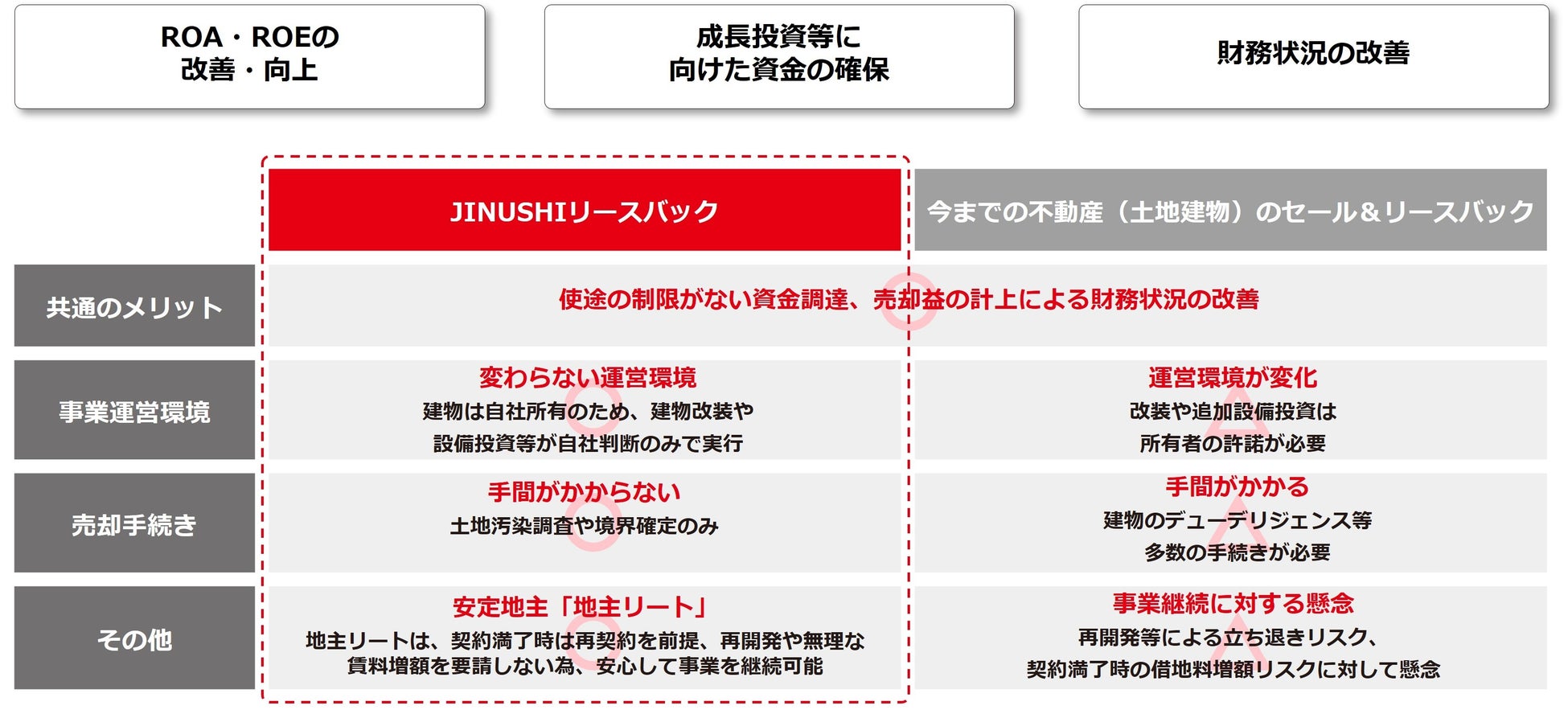 東京証券取引所が「資本コストや株価を意識した経営」を上場企業に求める中、所有不動産の有効活用を図るべく、CRE(企業不動産)戦略を推進する企業が増加しています。そうした状況下、JINUSHIリースバックは、売却手続きに手間がかからず、かつ事業運営環境を変えることなく、成長投資等に向けた資金の確保や、経営指標・財務状況の改善が図れる手法です。