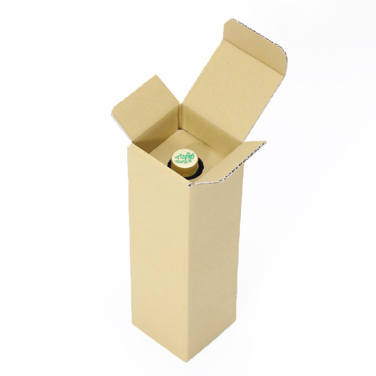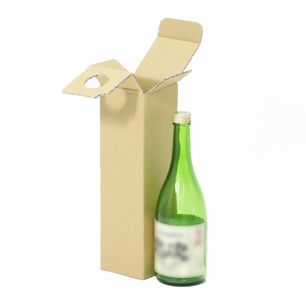 四合瓶(720ml)が入るサイズに設計しており、箱の中には瓶の固定・保護性能を高めるための首押さえを設けております。クラフト感のある両面茶色のダンボールを使用しておりますので、日本酒をはじめ、焼酎やワイン、クラフトビールなどの瓶を梱包する際にもおすすめのパッケージです。