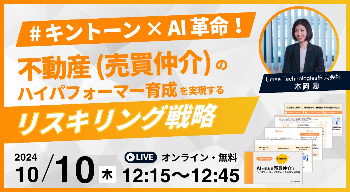 新人からトップセールスを輩出するコネクテッドセールス・プラットフォーム*「Front Agent」を開発・提供するUmee Technologies株式会社(本社:東京都調布市、代表取締役:新納 弘崇、以下「ユミー」)は、10月10日(木)12:15〜12:45にオンラインセミナー「キントーン×AIで売買仲介のハイパフォーマー育成を実現!リスキリング戦略とは」を開催いたします。