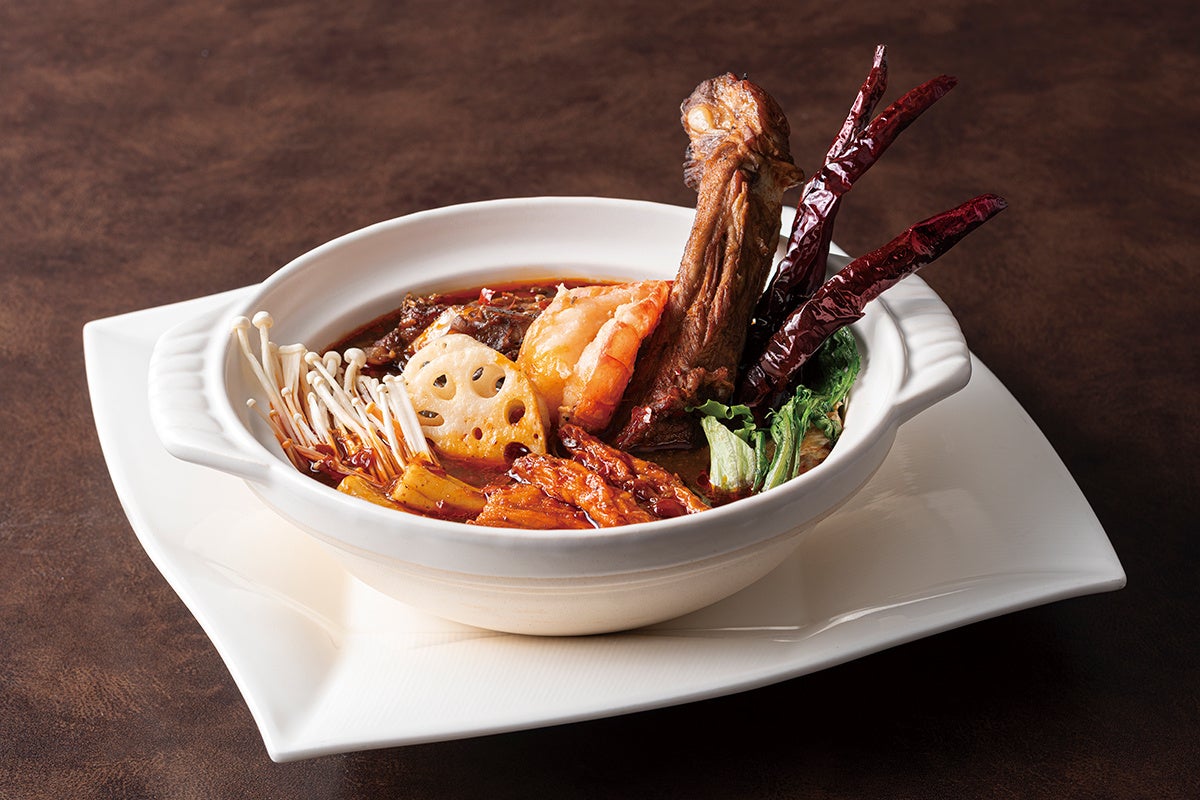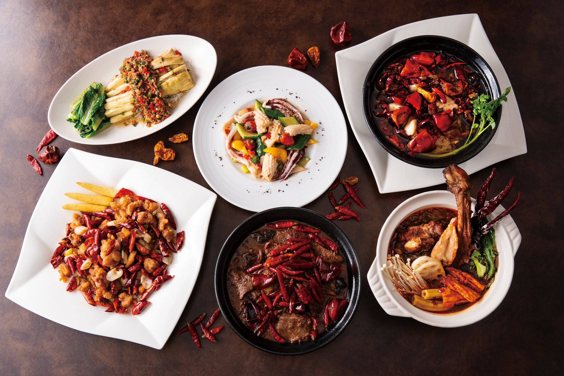 仕上げに油を豪快に注ぎ唐辛子と香辛料の風味を一気に際立たせる料理法で作る「白身魚の山椒唐辛子オイル仕立て」や、唐辛子花椒の香りを引き出し香ばしく揚げた鶏肉と合わせた「鶏もも肉の楽山風唐辛子炒め」、牛肉と相性のよい茄子を蒸して旨味を引き出し、柔らかく深みのある辛味とまろやかな酸味を纏わせた「蒸しナスの牛肉入り発酵唐辛子ソース」、重慶飯店本館の名物 火鍋のスープをベースにした、海老や揚げゆばなどの具材とともにクセになる味わいを楽しめる「やわらかスペアリブ入り 豪華具材入り麻辣湯(マーラータン)」、発酵唐辛子ならではの奥深い風味が、旬のスルメイカの甘みを引き立て辛さの中にほのかな酸味を感じることができる「自家製発酵唐辛子とスルメイカの炒め」、そして激辛の唐辛子『満天星(マンテンシン)唐辛子』と熟成豆板醤を使用し、ただ辛いだけでなくバランスのとれた味わいと素材の旨味も重視した「激辛!牛ヒレ肉の山椒唐辛子煮込み麺」の全6種をご用意いたしました。夏の暑さを吹き飛ばし、食欲をかき立てる逸品の数々を、ぜひ重慶飯店本館でお楽しみください。