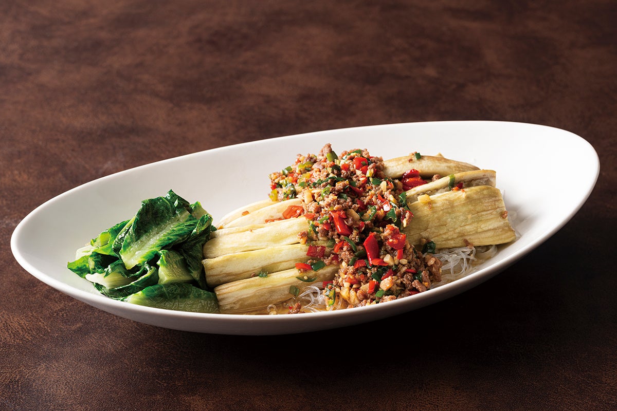 〈辛さレベル1〉自家製の発酵唐辛子を使用し、牛挽肉に旨味もプラスした一品。牛肉と相性のよい茄子を蒸して旨味を引き出し、柔らかく深みのある辛味とまろやかな酸味を纏わせました。