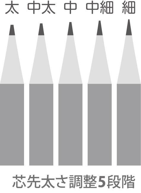 芯の太さは5段階(細・中細・中・中太・太)で調整でき、好みの鋭さで用途に合わせて使えます。削れる鉛筆の長さは約65mmまで。最短切削可能長の実寸大シール付きで、お子様にも安心してご使用いただけます。