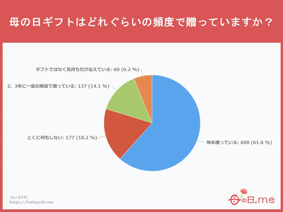 母の日ギフトを贈る頻度に関するアンケート調査(n=974)によると、「毎年贈っている」が61.6%と、前年よりも6ポイント増加する結果となりました。「毎年贈っている」と答えた人の中には、「恒例となっているから」という意見が多くあった他、「感謝を形に変えられる日だから」「大好きなお母さんに贈らない選択肢はない」という愛情と尊敬の念を表すコメントもみられました。また「特に何もしない」と答えた人の理由として、毎年母の日にギフトを贈る習慣がないことや、他の機会に母親への感謝を示しているため、母の日に特別なことをしないといった意見もありました。