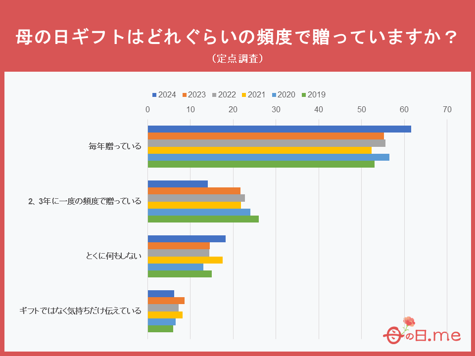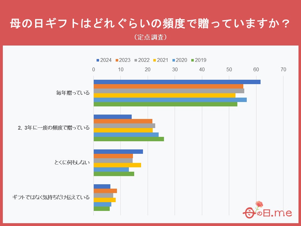 過去5年間の定点調査によると、2024年では「毎年贈っている」と回答した人は61.6%となり、過去(2023年:55.2%、2022年:55.6%、2021年:52.4%、2020年:56.5%、2019年:53%)と、今年は例年より大きく増加していて、毎年欠かさず母の日のプレゼントを贈っている人が沢山いる事が分かりました。また、逆に『2、3年に一度贈っている』と答えた人の割合は過去6年間で最も低くなりました。これは、数年に一度贈っていた人々が、直近の数年間で毎年母の日にプレゼントを贈る習慣が定着してきたと考えられます。
