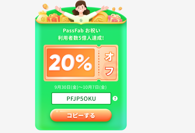 株式会社PassFabは、製品の利用者数が5億人を突破したのをお祝うため、9月30日(金)~10月7日(金)まで全製品に対して20%割引を行います。割引クーポン:PFJP50KU