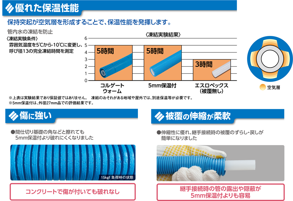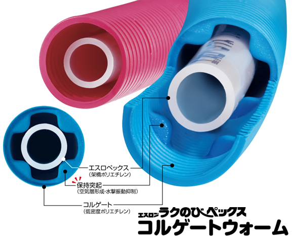 「エスロン®ラクのびペックス コルゲートウォーム」は、戸建やマンションなどの住宅用給水・給湯配管として使われている5mm保温付き架橋ポリエチレン管と同等の優れた保温性を持ち、被覆保温材部の耐傷性と伸縮性を向上させることで、現場のさらなる易施工に貢献します。