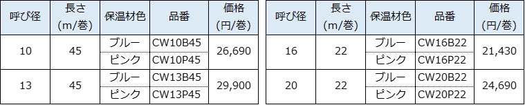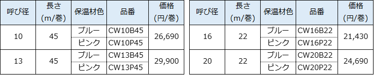 呼び径10、13、16、20の4口径×2色(ブルー/ピンク)を品揃えいたします。