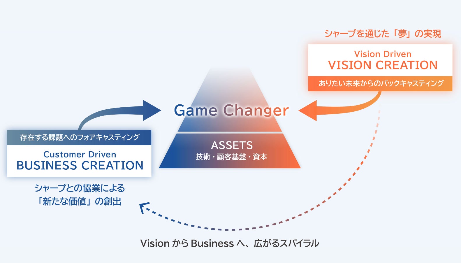 シャープが有する独創的な技術・企画の創出力と、スタートアップやクリエイターの皆さまからのデバイスや製品に限定されない新規ソリューションの共創アイディアを融合し、Game Changerの実現を目指します。