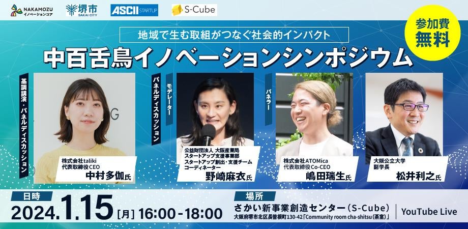 今回は、「中百舌鳥イノベーションシンポジウム-地域で生む取組がつなぐ社会的インパクト-」と題し、持続可能な社会をめざし課題解決を加速化させる社会起業家の株式会社taliki 代表取締役 中村 多伽氏による基調講演と、中村氏に加え、地方から「人と場所とIT」でイノベーションを創出する株式会社ATOMica 代表取締役 嶋田 瑞生氏、次代のアントレプレナーシップ教育を担う大阪公立大学 副学長 松井 利之氏の3名によるパネルディスカッションから、地域発のイノベーションについて考察を深めます。