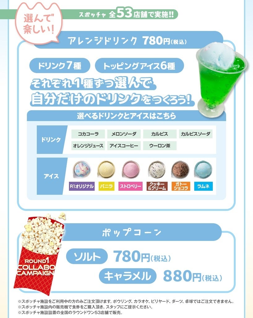 全国のボウリング、カラオケ、ダーツ、ビリヤード全91店舗でコラボドリンク・コラボフードを、スポッチャ全53店舗ではアレンジドリンクとコラボポップコーンを販売いたします。