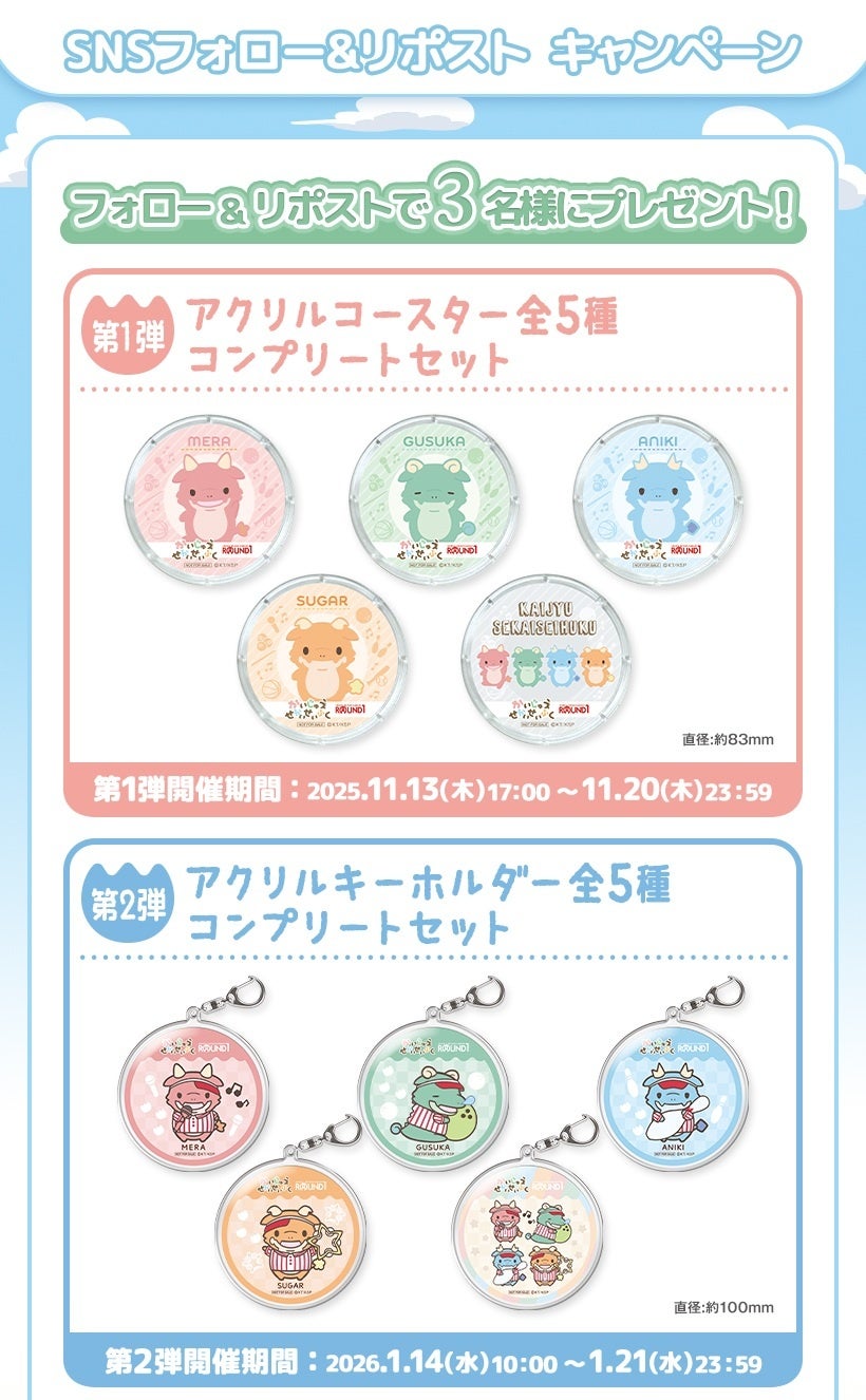 ラウンドワンライブ&コラボ公式X(@round1_fanevent)とかいじゅうせかいせいふく公式X(@kaijyu_sekai)をフォローし、対象ポストをリポスト頂いた方の中から抽選で前半・後半各3名様ずつに、オリジナルグッズのコンプリートセットをプレゼントいたします。