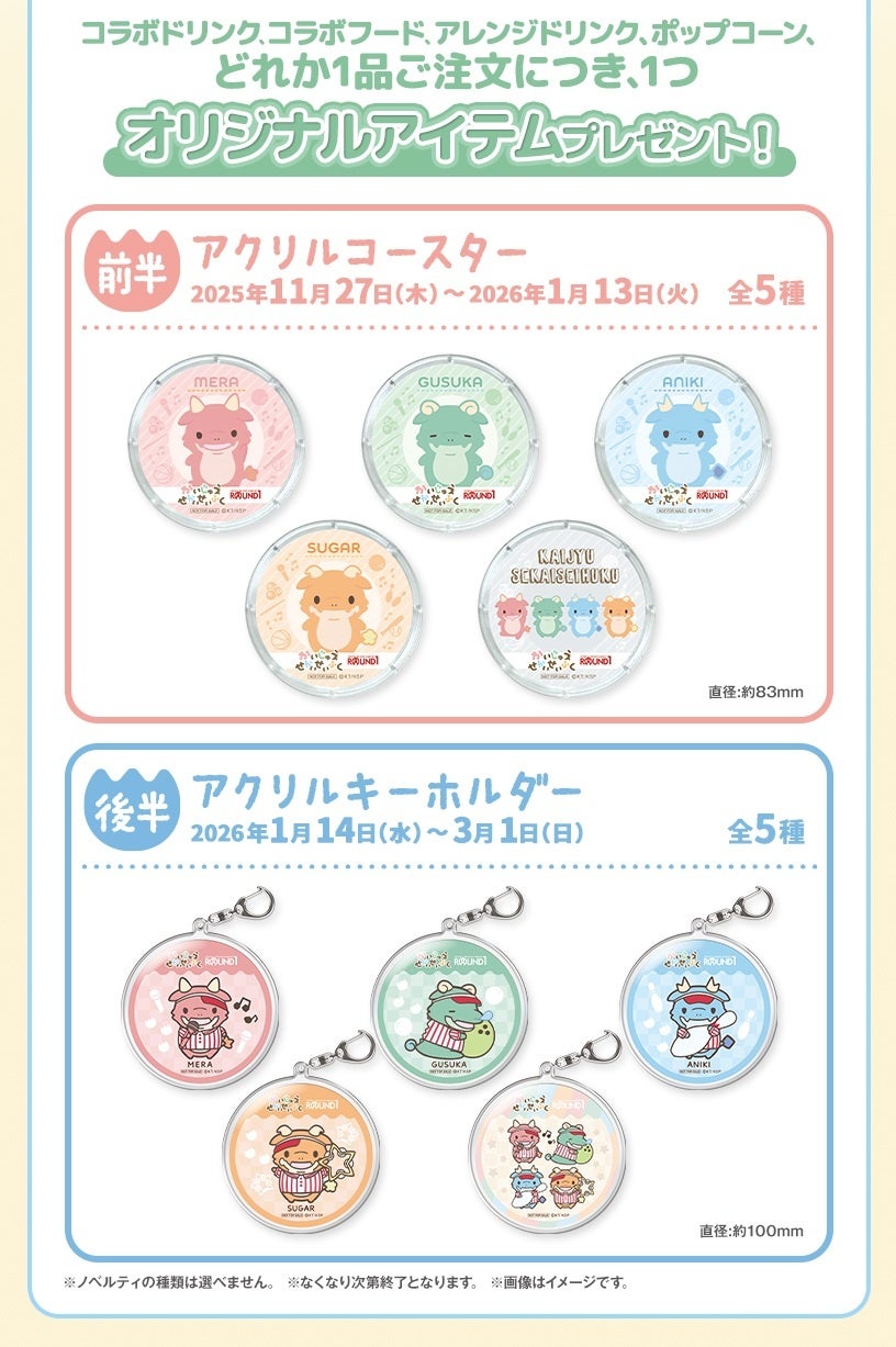 コラボメニューをご注文のお客様には、オリジナルアクリルコースター(全5種)またはオリジナルアクリルキーホルダー(全5種)をプレゼントいたします。