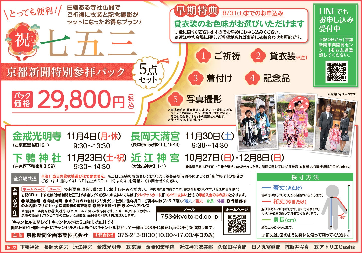 京都新聞グループの京都新聞企画事業株式会社では、子どもたちの健やかな成長を願う「祝 七五三特別参拝パック」の申込受付を開始いたしました。