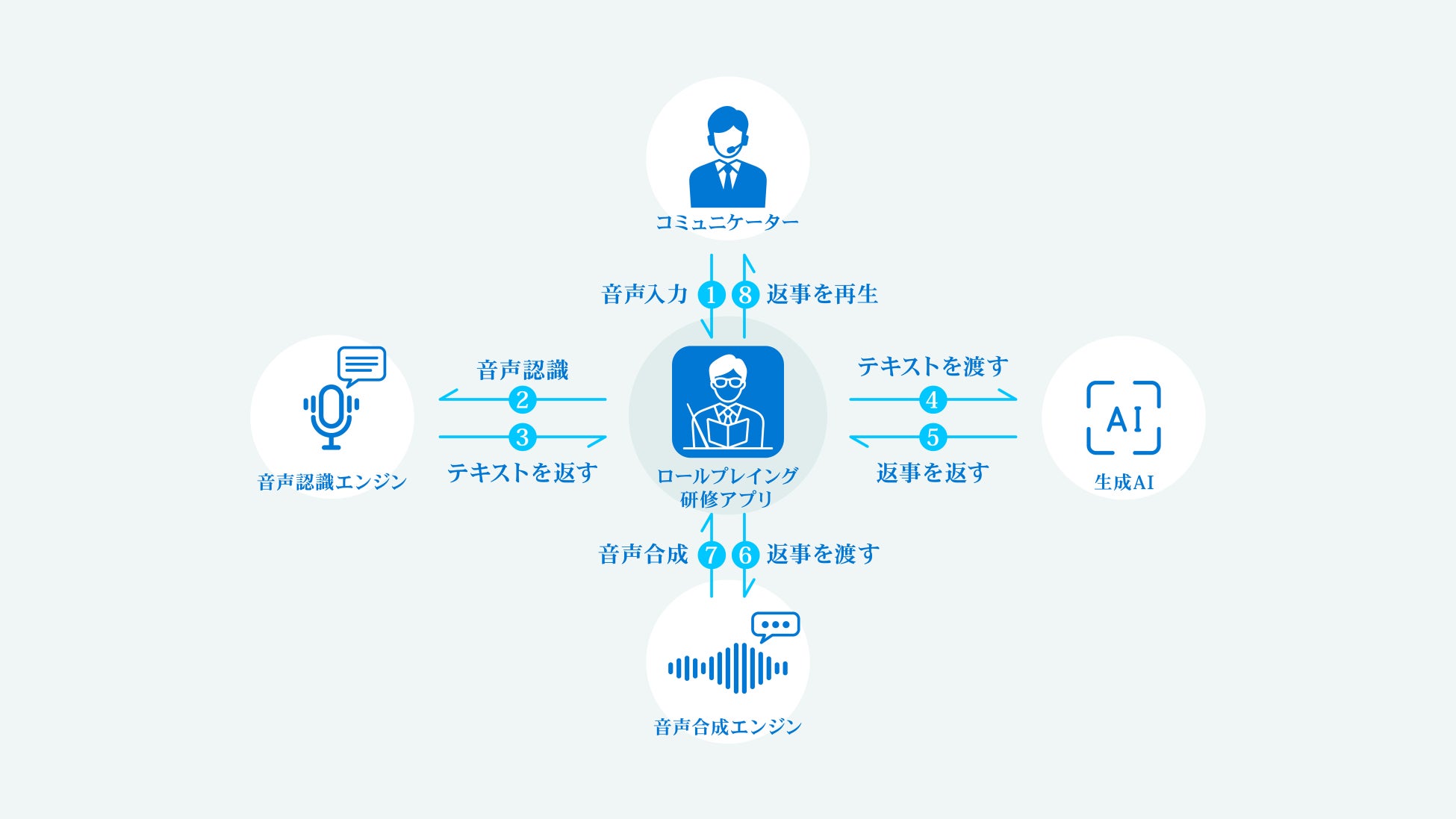 本アプリは、生成AIにより、コンタクトセンターでの問い合わせを想定したロールプレイングから、応対評価によるフィードバックまでを自動で行う研修用アプリです。