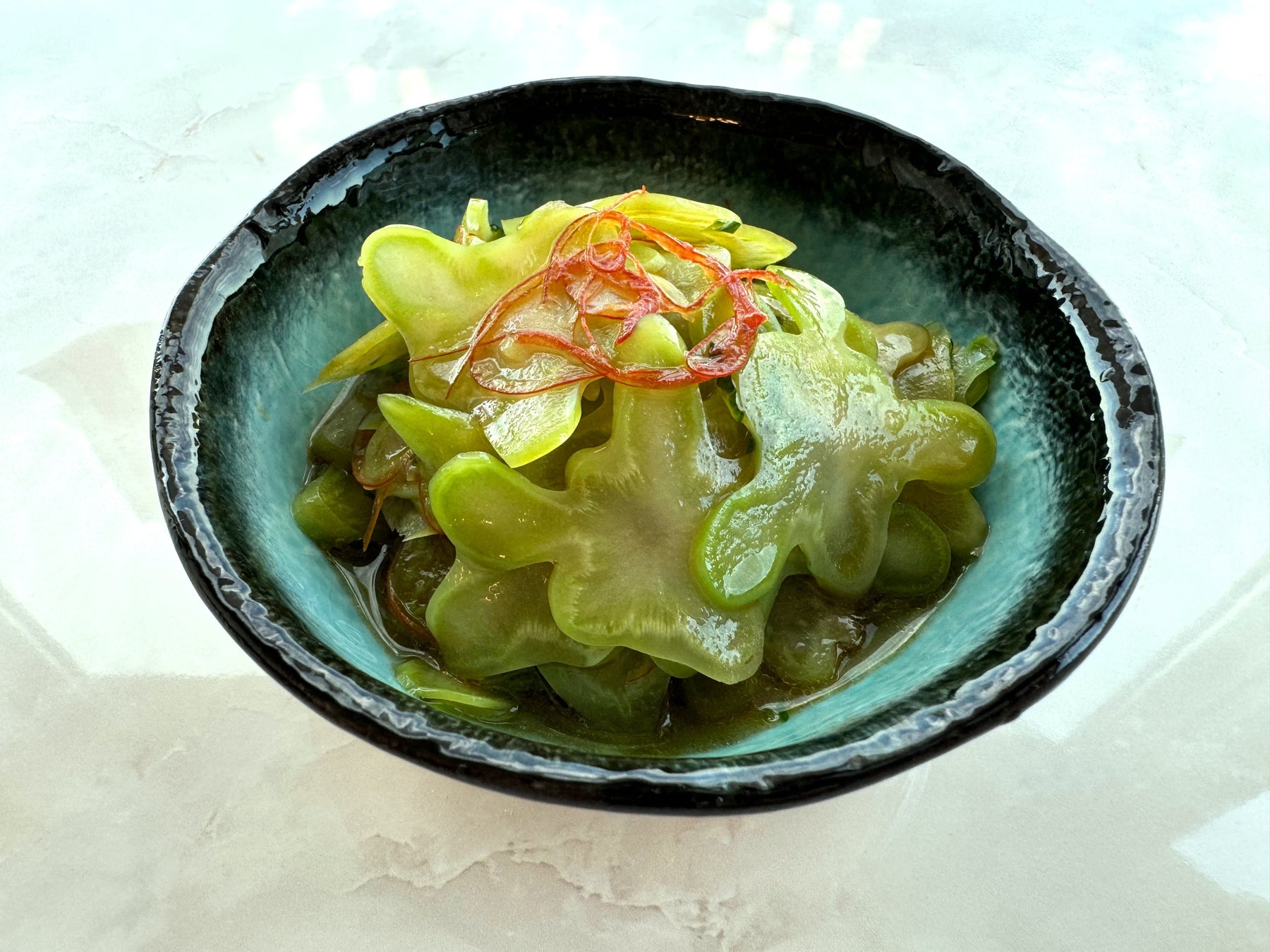 ブロッコリーの茎は硬い部分もあり、廃棄が多くなってしまいがちです。この茎を薄くスライスし、昆布〆めの状態で冷凍することで、綺麗な翡翠色を保ち、旨味もプラスすることができ、一気に主役級の1品に!