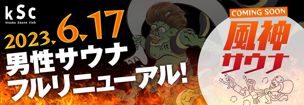 2023年6月17日(土)に既存のサウナ室をフルリニューアルし、“風神サウナ”を男性浴室にオープンします。サウナにこだわりを持つ社員による「kSc -kisuke Sauna club-」(キスケサウナクラブ)のプロデュースのもと、サウナーメーカーと共同開発した大型ロウリュストーブに、業界最大級の爆風体験ができる「風神熱波」(自動ロウリュ)をお楽しみいただけます。