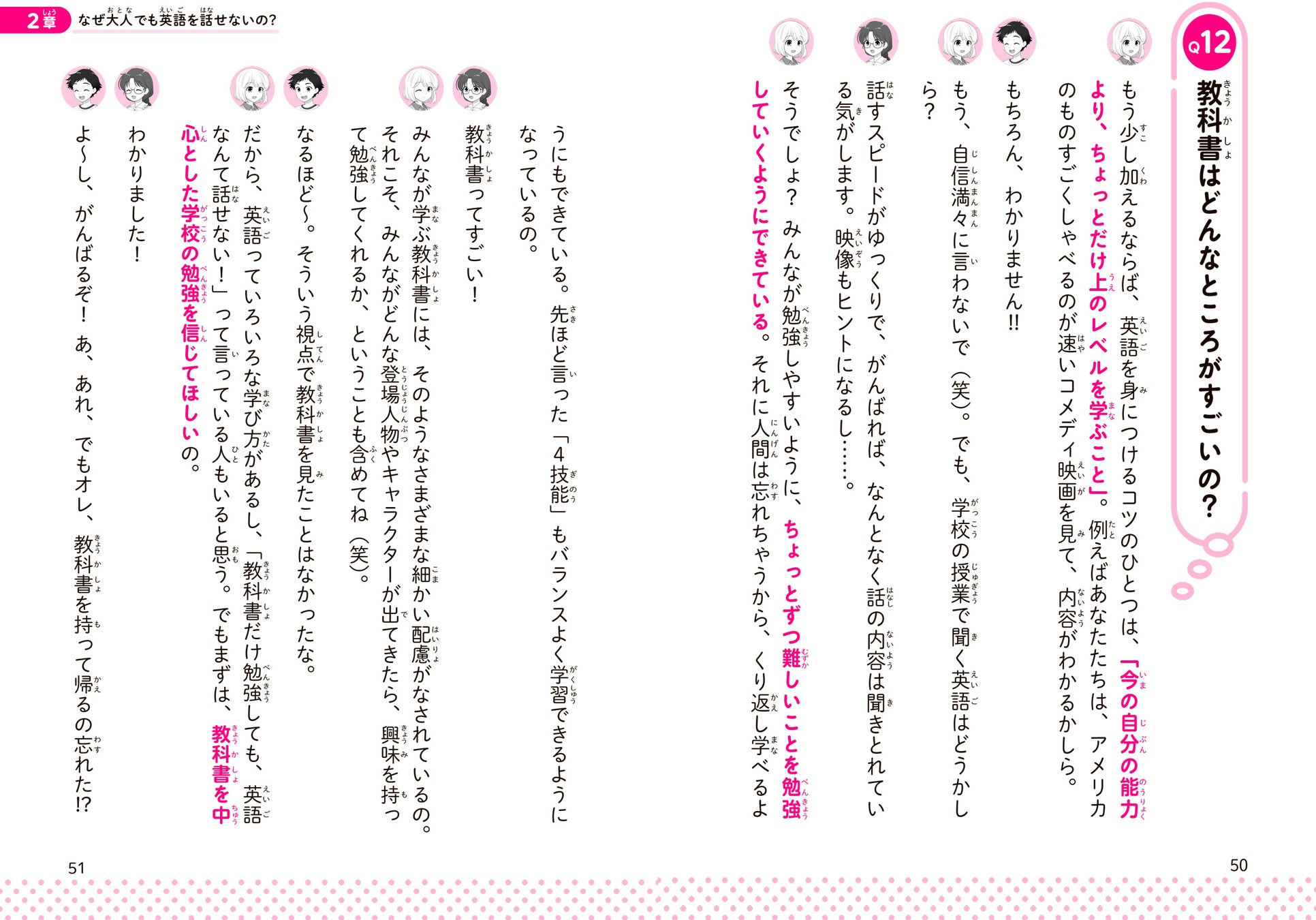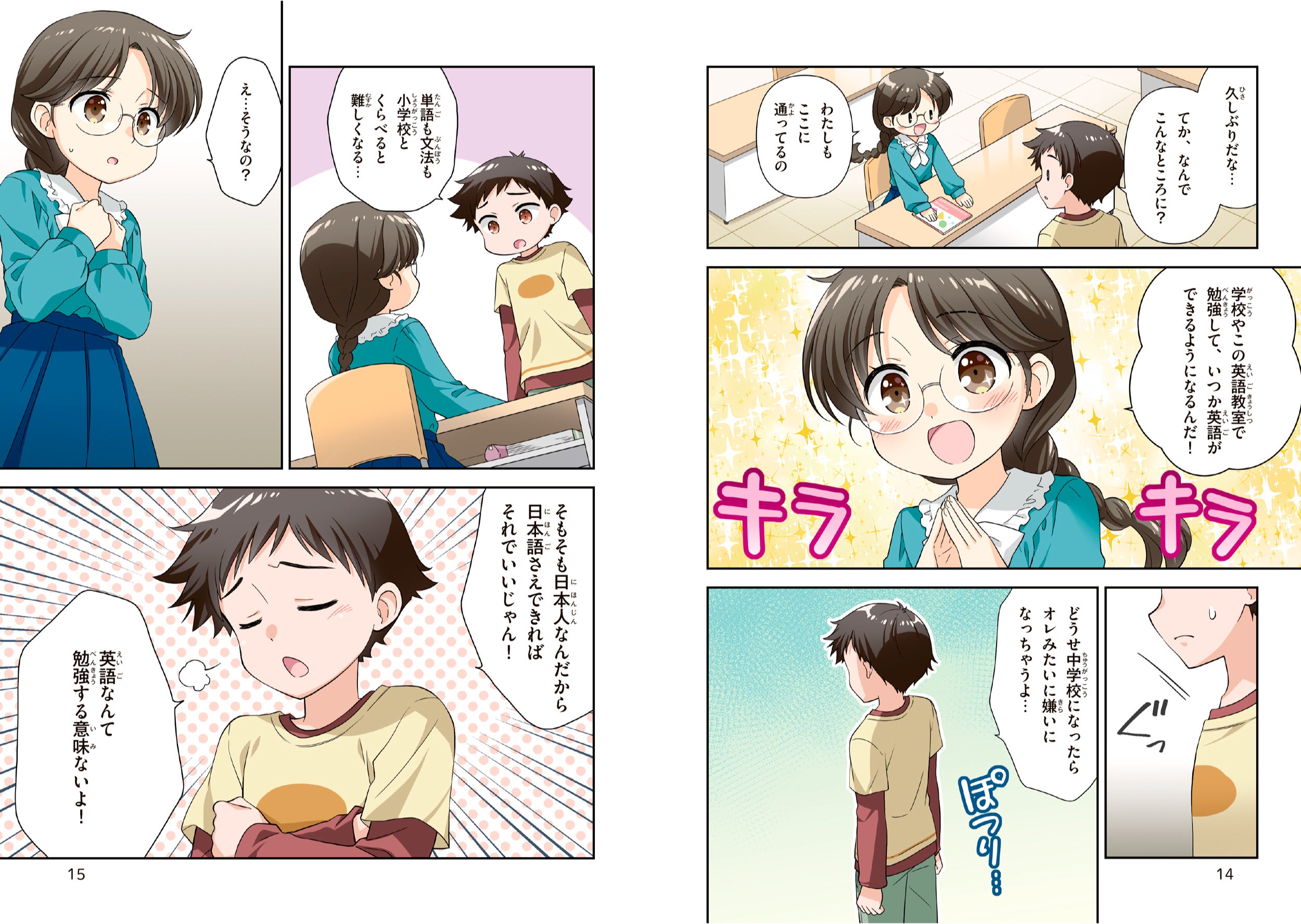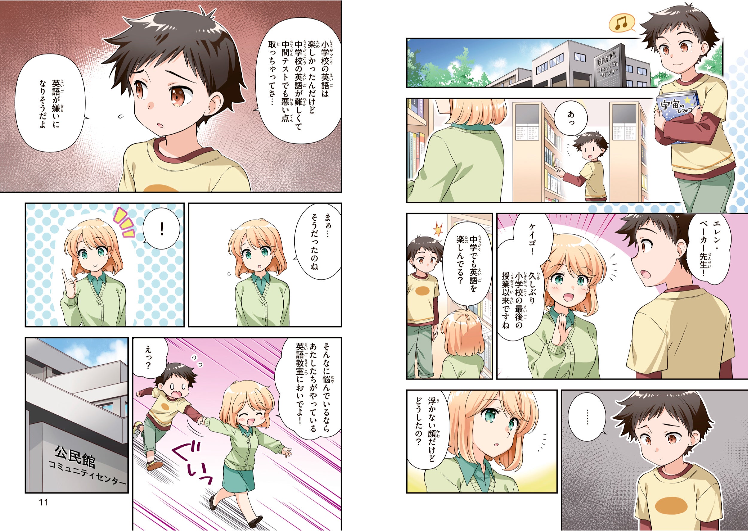 ALTのエレン・ベーカー先生がボランティアで開催している英語教室に、もっと英語を勉強したい小学生と、英語が苦手になりかけの中学生がやってきたという設定で、マンガを中心にしたストーリー形式の構成となっており、英語を学ぶための基本、日本語と英語の違いなどを楽しく学んでいただける入門書となっています。