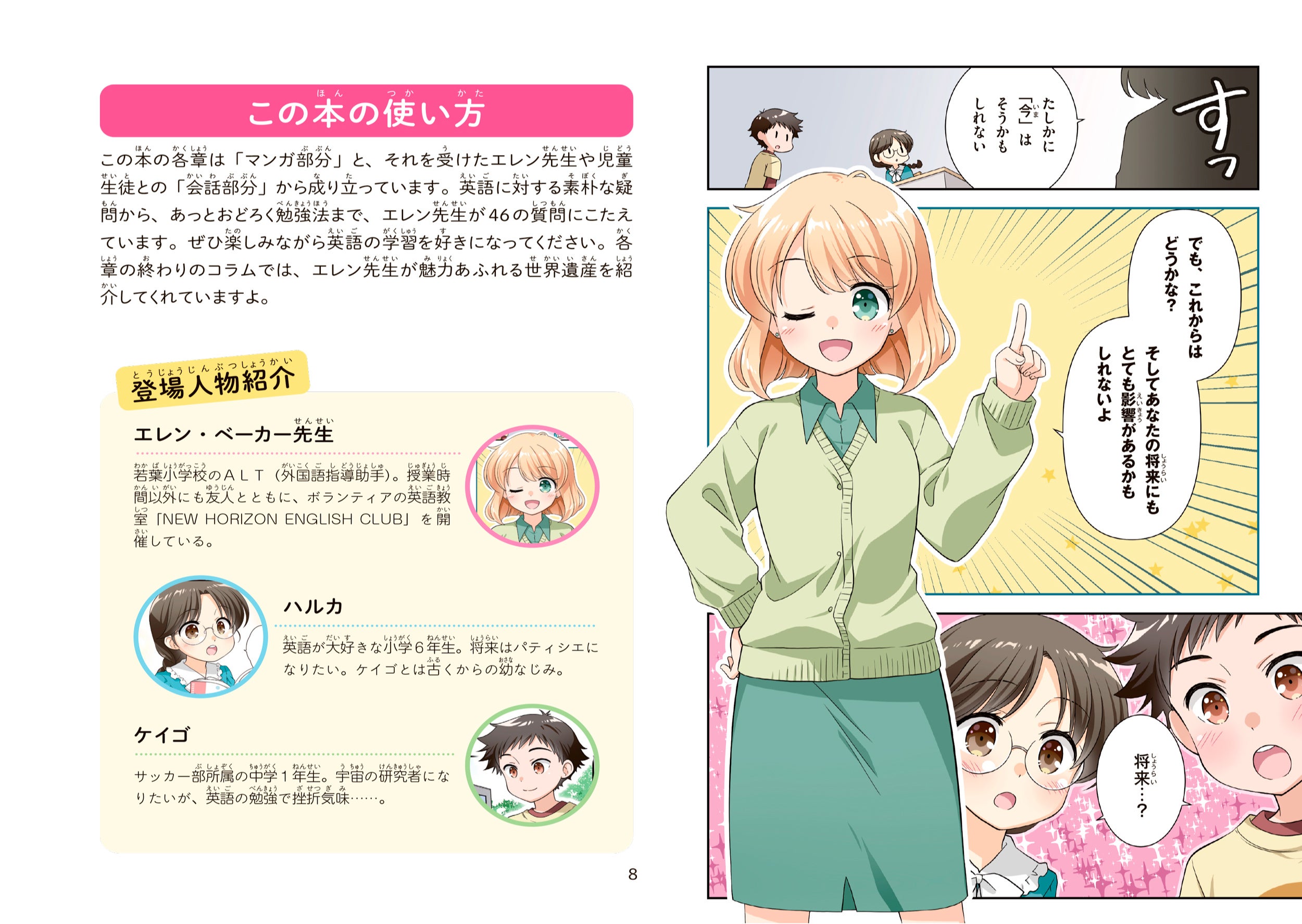 『エレン・ベーカー先生 はじめての英語教室』(監修:アレン玉井光江)は、弊社が発行する、令和6年度小学校英語検定教科書『NEW HORIZON Elementary』に登場しているキャラクターである、エレン・ベーカー先生をナビゲーターとした、英語の学習参考書です。