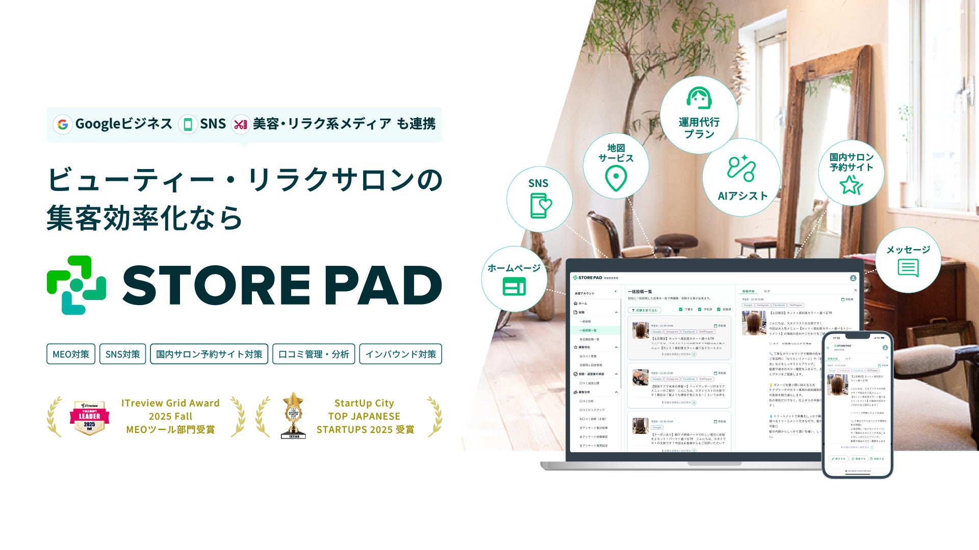 「STOREPAD」は、美容室やリラクサロンの情報発信と集客施策をまとめて効率化し、集客効果の最大化をサポートします。Googleマップ、ホットペッパービューティー、SNSなど主要な集客媒体を一元管理。AI分析やスマートな投稿機能でスタッフの作業負担を軽減しながら、店舗の集客力とMEO効果の向上を実現します。