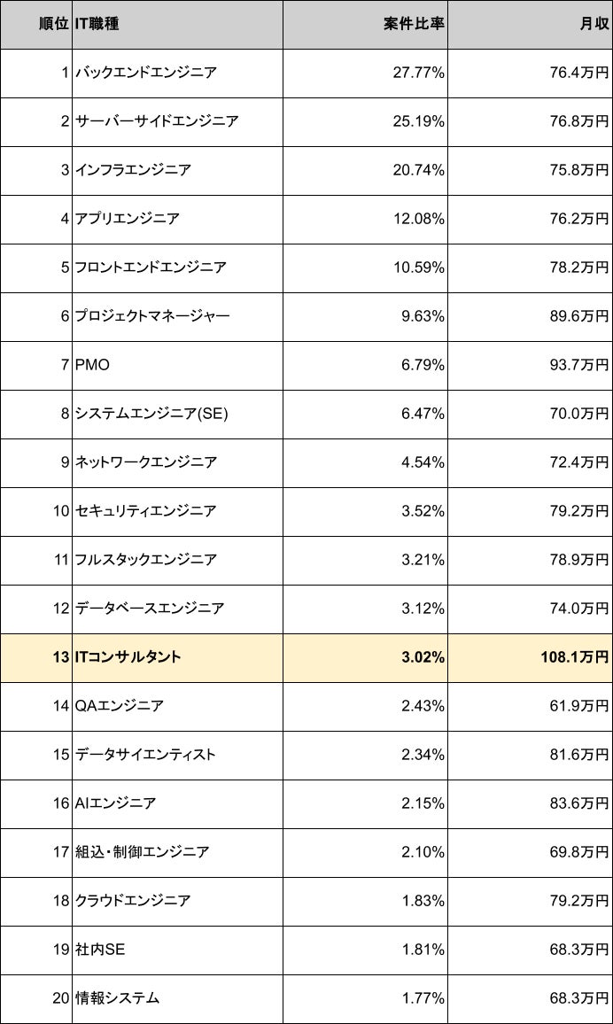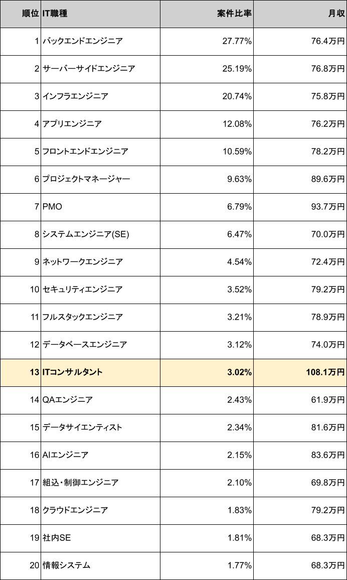 ITコンサルタントの職種別案件数ランキングは13位(案件比率 3.02%)