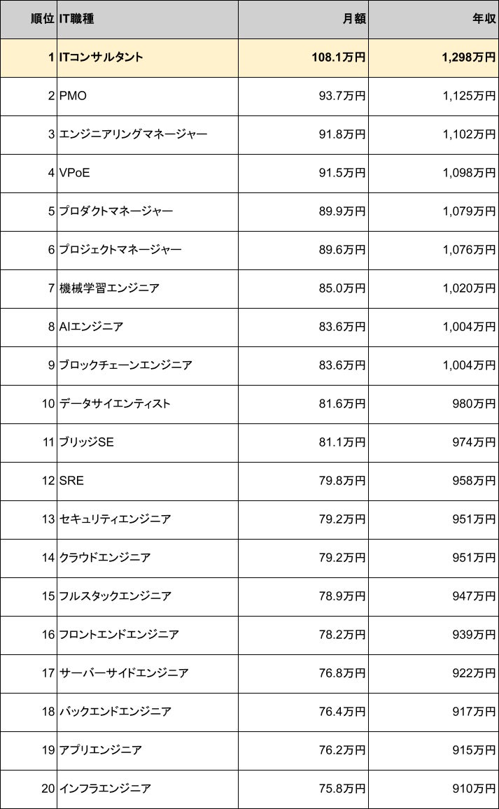 ITコンサルタント案件の平均月額単価は108.1万円、平均年収は1,298万円で、職種別平均年収ランキングでは1位に位置しています。