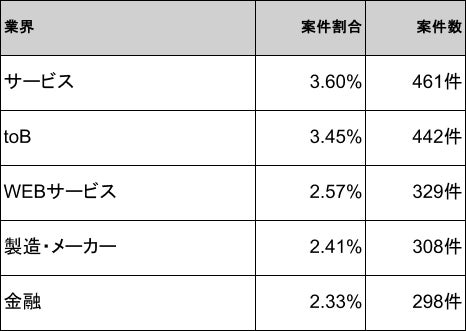2026年1月時点のITコンサルタント向けフリーランス案件・求人は、サービスが3.60%(461件)で1位、toBが3.45%(442件)で2位、WEBサービスが2.57%(329件)で3位となっています。以下、製造・メーカーが2.41%(308件)で4位、金融が2.33%(298件)で5位と続き、上位5業界で全体の約14.4%を占める結果となりました。
