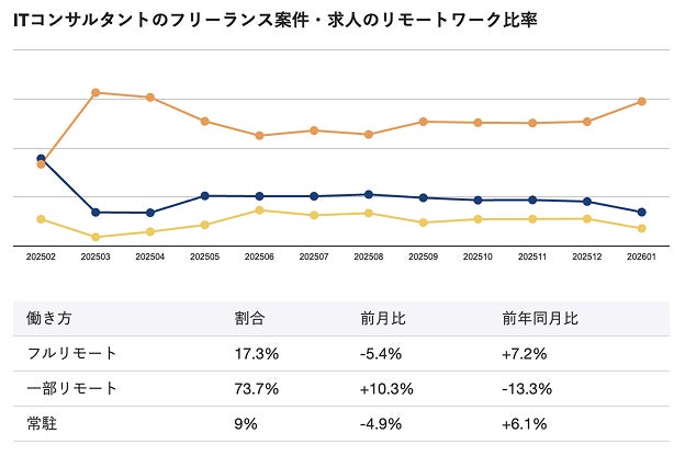 2026年1月時点のITコンサルタント向けフリーランス案件・求人におけるリモートワーク比率は、フルリモートが17.3%、一部リモートが73.7%、常駐が9%となっています。