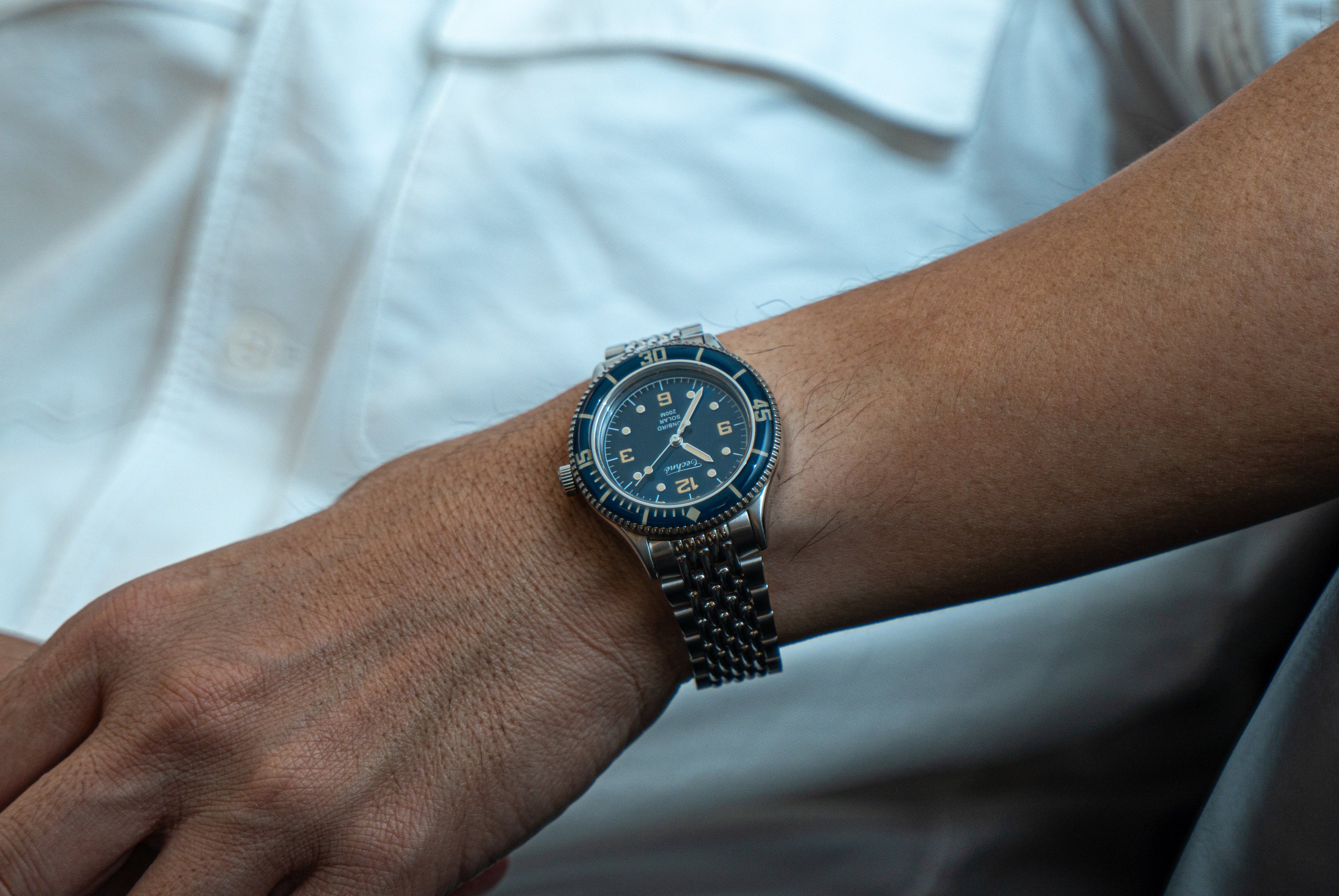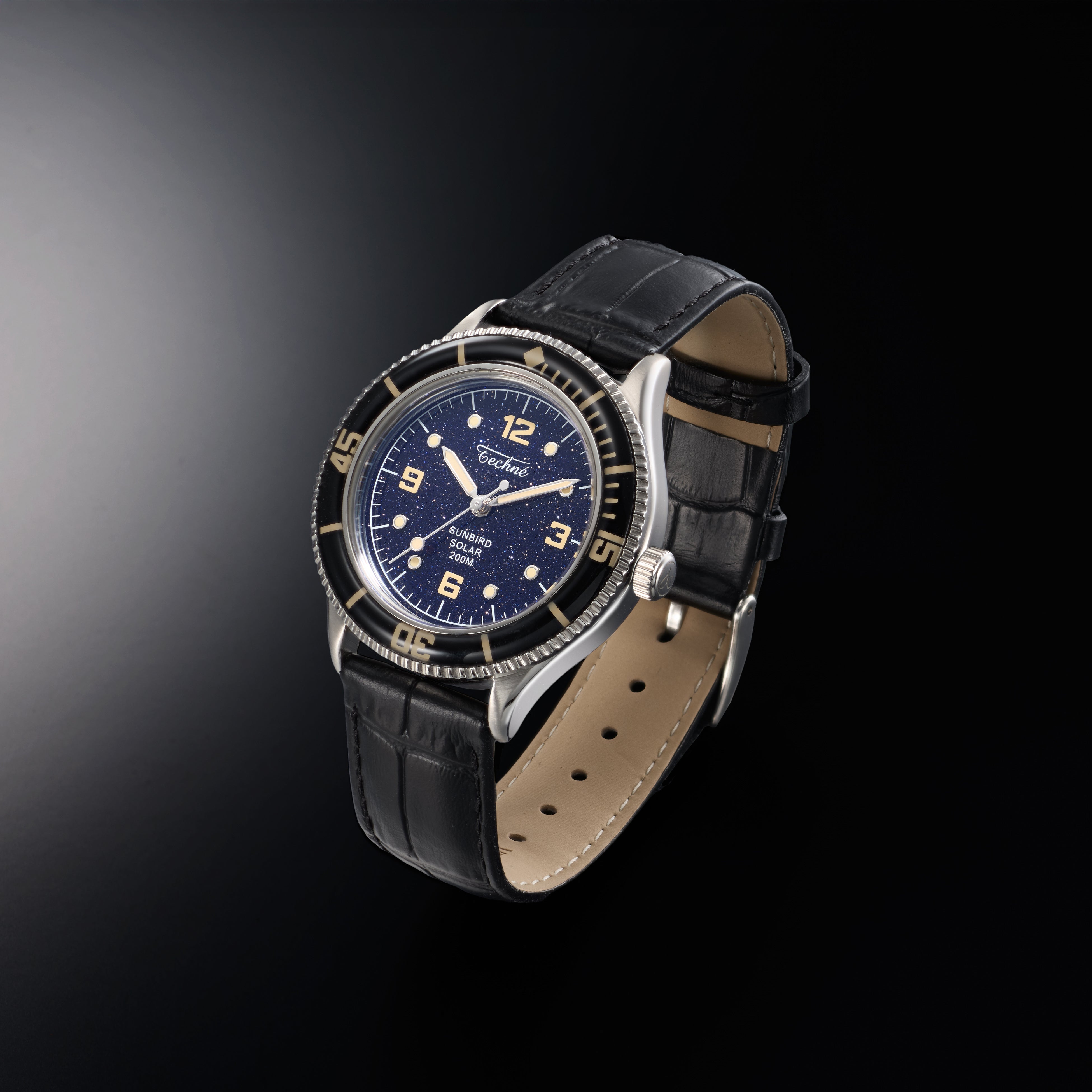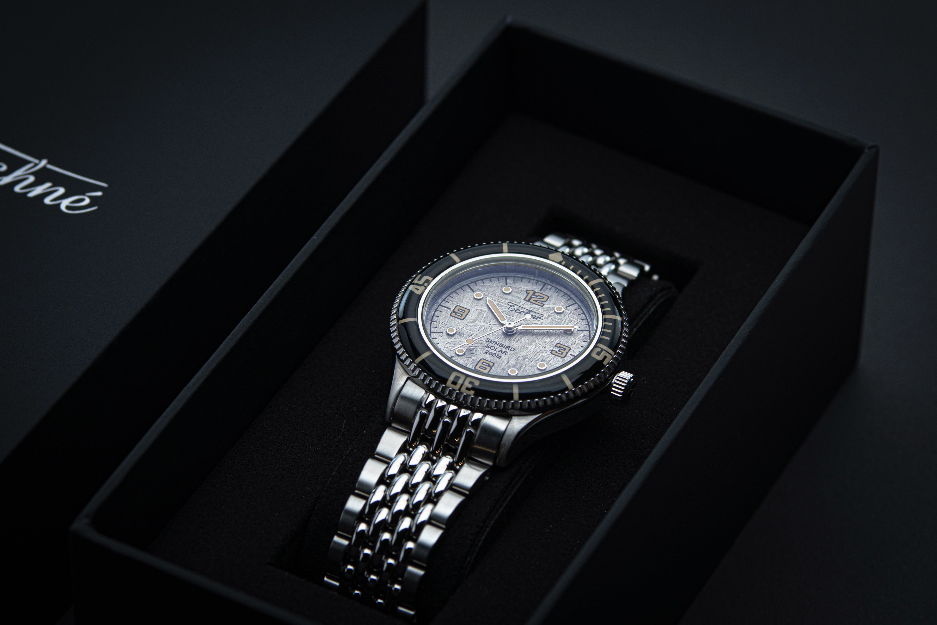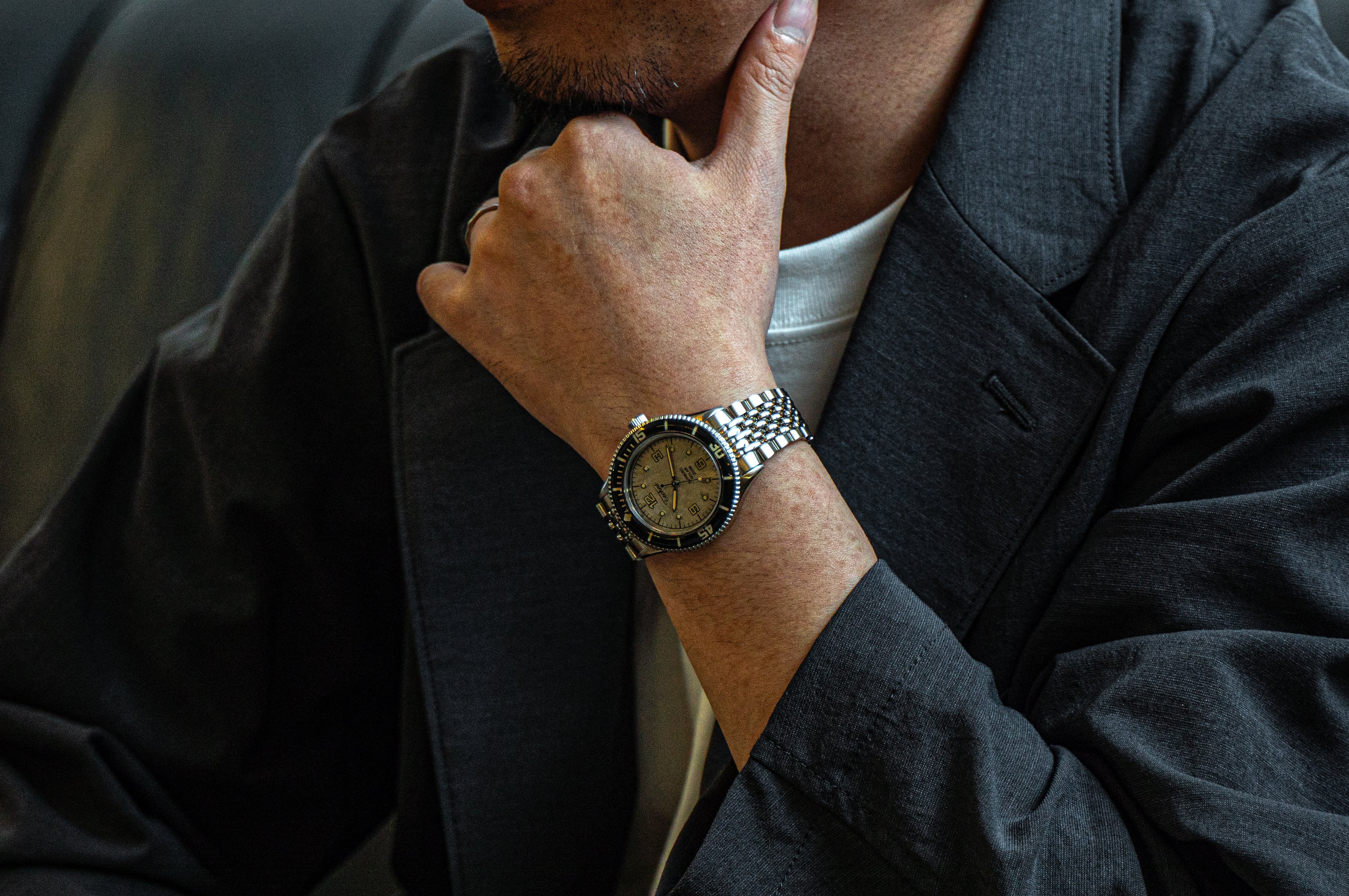 構想1年、製作2年の歳月を経て完成した今作は、特殊素材“メテオライト”“アベンチュリン”ダイヤル×200M防水×ソーラームーブメント搭載の“本気のヴィンテージダイバーズウォッチ”。“ヴィンテージとテクノロジーの融合”をテーマに掲げ、1970年代のクラシックダイバーズを現代的に再解釈。ソーラー駆動ながら、素材・機能・美しさのすべてを妥協なく仕上げた1本です。