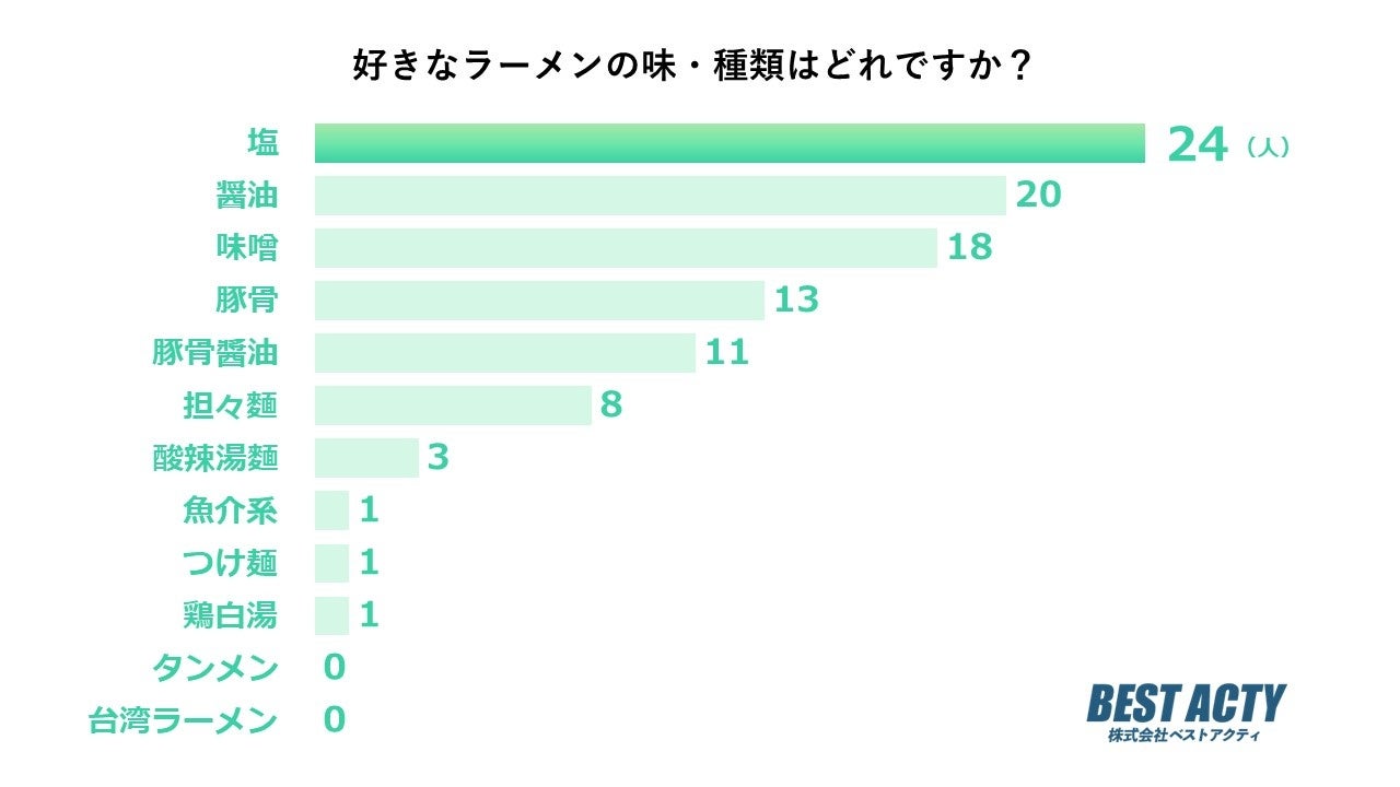 好きなラーメンの味・種類について100人にアンケートを行ったところ、「塩」と回答する人が最も多い結果となりました。