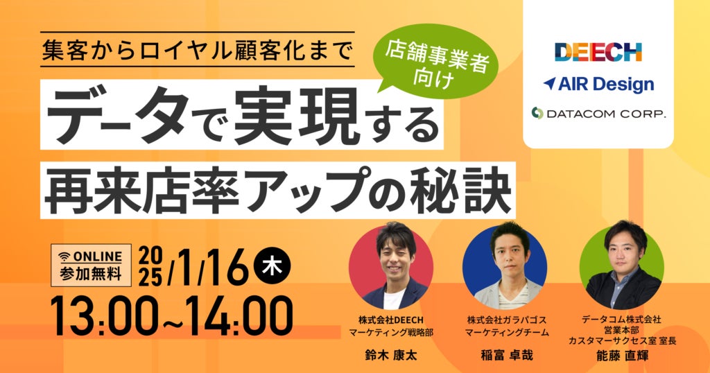 小売業界に特化した商品・顧客分析ソリューションを始めとする、パッケージシステムを開発・提供しているデータコム株式会社(本社:宮城県仙台市、代表取締役:小野寺修一)は2025年1月16日(木)に株式会社DEECH(本社:東京都新宿区、代表取締役CEO:小菅義和)、株式会社ガラパゴス(本社:東京都千代田区、代表取締役:中平 健太)と共催ウェビナーを開催いたします。