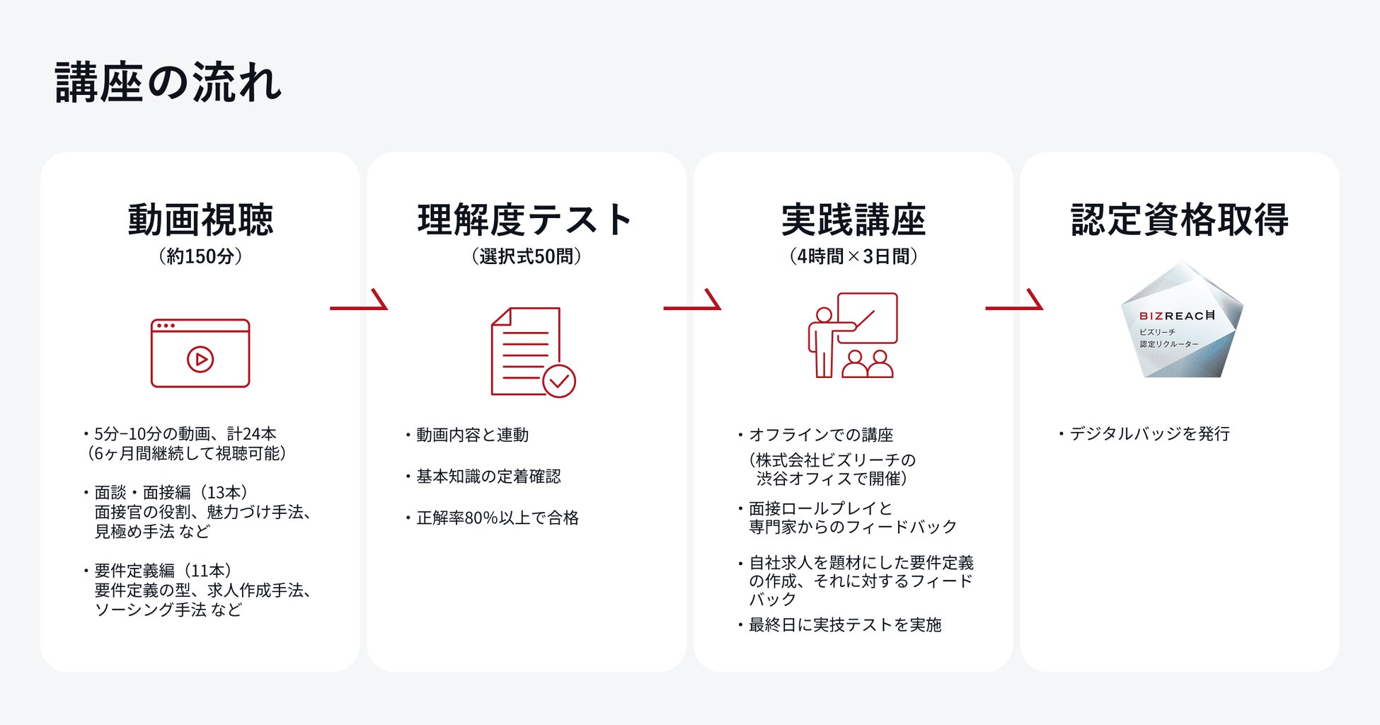 本認定資格を取得するためには、採用活動力に必要なスキルを実践的に学ぶことのできる「ビズリーチ認定リクルーター育成講座」の受講が必須です。本講座は、オンラインでの動画視聴・理解度テストで基礎を固めた後、計12時間(4時間×3回)のオフラインでの実践講座へと進みます。実践講座は、受講者の自社求人を題材に模擬演習を行うことが大きな特徴で、講座を通じて専門のトレーナーから充実したフィードバックを受けることができます。また、受講期間中には、課題の提出もあり、より深い理解を促進し、実践力の強化をはかります。本認定資格は、実践講座の最終回に実施される実技テストの合格者のみが取得できます。