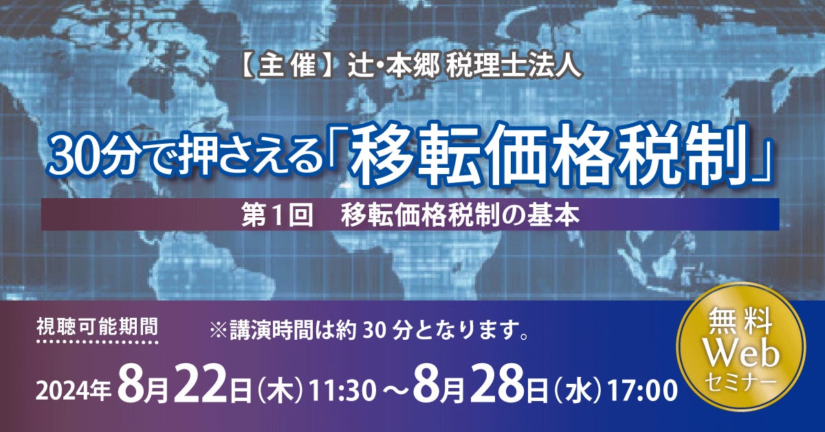 辻・本郷 税理士法人(本社:東京都新宿区、理事長:徳田孝司)は、2024年8月22日(木)より「30分で押さえる『移転価格税制』(第1回)移転価格税制の基本」セミナーを開催いたします。中小企業も近年は本格的な移転価格調査が行われるようになりました。海外展開している企業様は、海外子会社と取引をする場合の課税リスクを抑えるためにも、移転価格税制を正しく理解しておく必要があります。そこで、数回にわたって国際税務に精通した専門家が、移転価格税制を詳しく解説していきます。第1回は、移転価格税制の基礎となる部分を短時間で分かりやすく説明します。