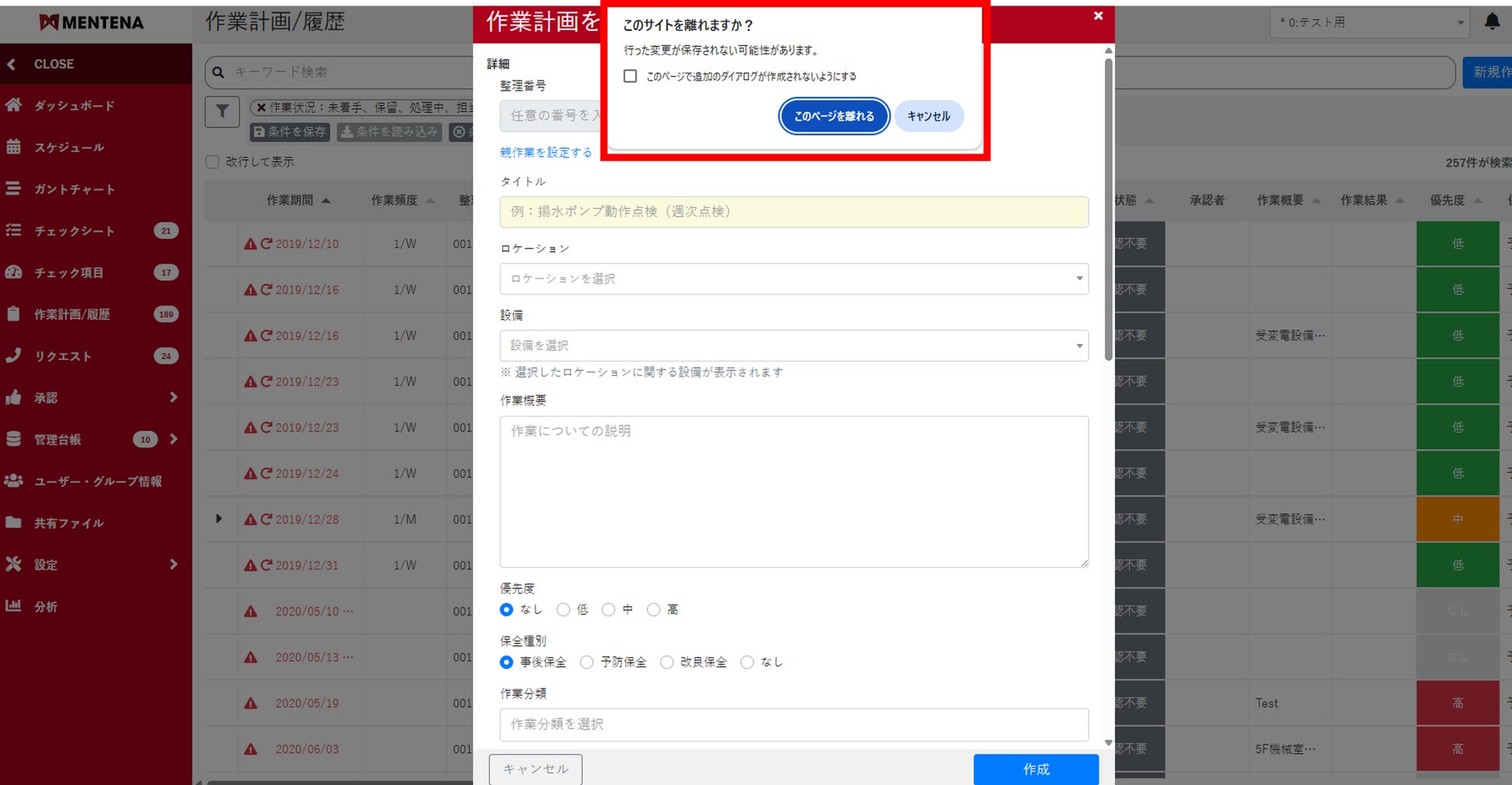 作業依頼をするためのリクエストやチェックシート、作業計画/履歴などの画面で、入力作業中に画面を閉じる際にアラートを表示する機能を追加しました。これらの画面は入力に10分間以上かかるケースが多く、誤ってページを閉じてしまった際に長時間かけて入力した内容が消えることを防ぎ、やり直しによる時間のロスを減らします。