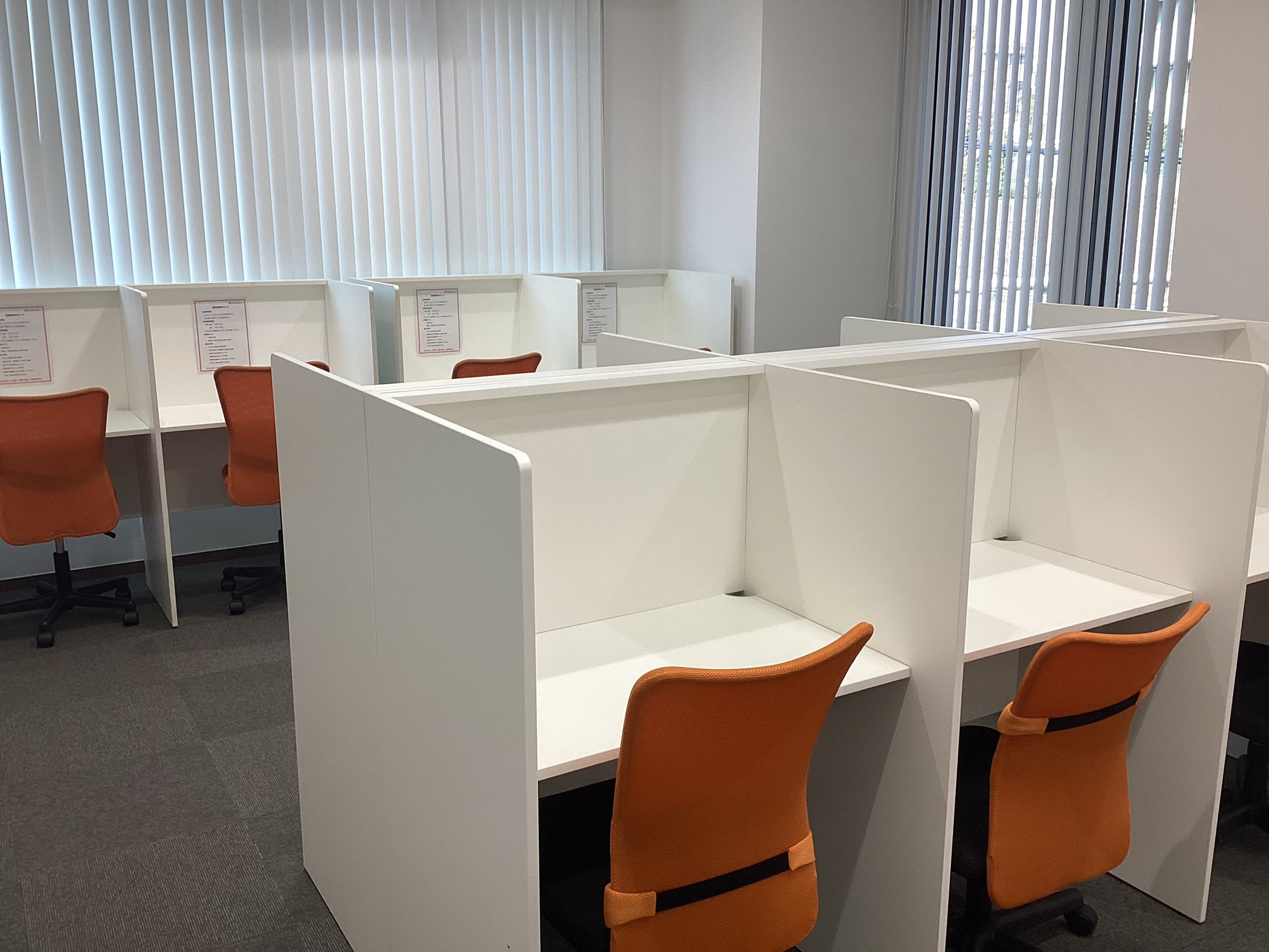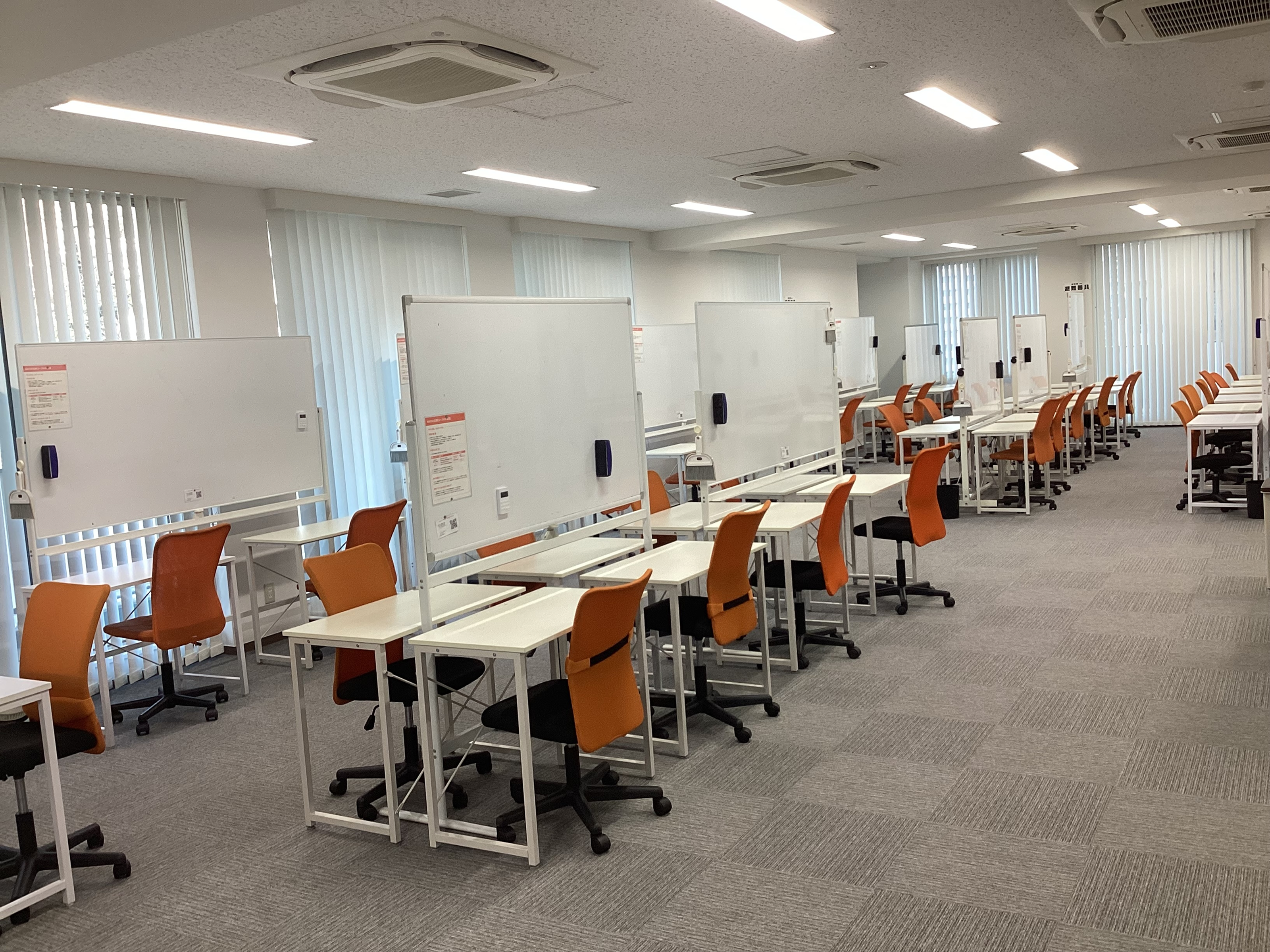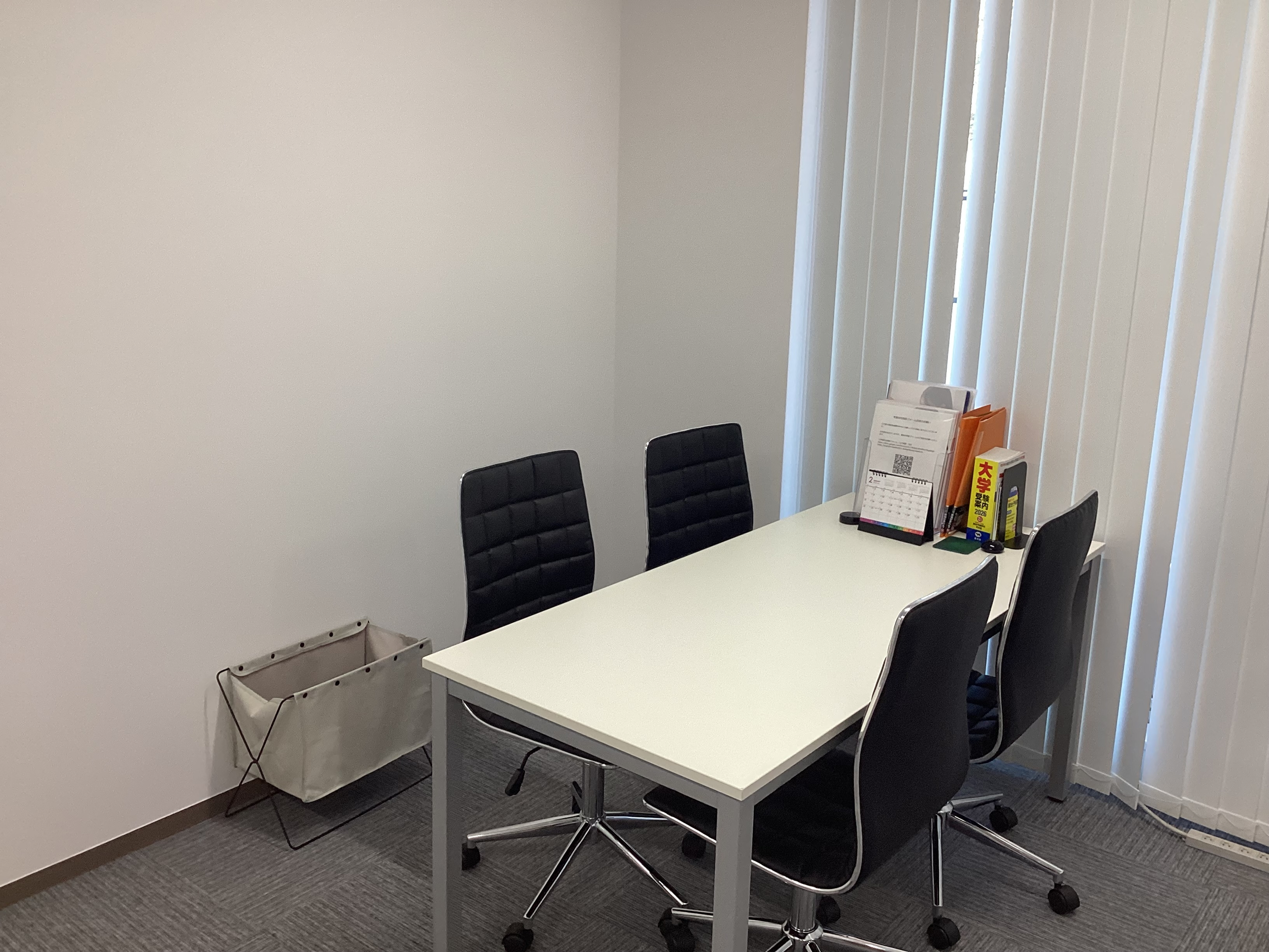 新教室では、生徒一人ひとりが十分なパーソナルスペースを確保できるよう、広々とした空間設計を採用しています。エントランスから自習スペース、授業エリアへの動線も整理され、長時間の学習でも集中力が途切れない環境を構築しました。また、保護者さまとの定期的な学習相談を実施するための専用の面談ブースも完備しています。