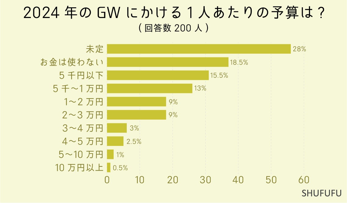 2024年のGWにかける1人あたりの予算を尋ねたところ、1位は「未定(28.%)」、2位「お金は使わない(18.5%)」となりました。自宅で過ごすという方はお金を使わずに楽しむようです。