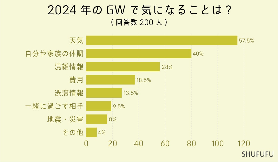 2024年のGWで気になることに関しては1位「天気(57.5%)」、2位「自分や家族の体調(40%)」でした。出かける時に天気が悪かったり体調が優れないと予定通りに楽しむことができないですよね。