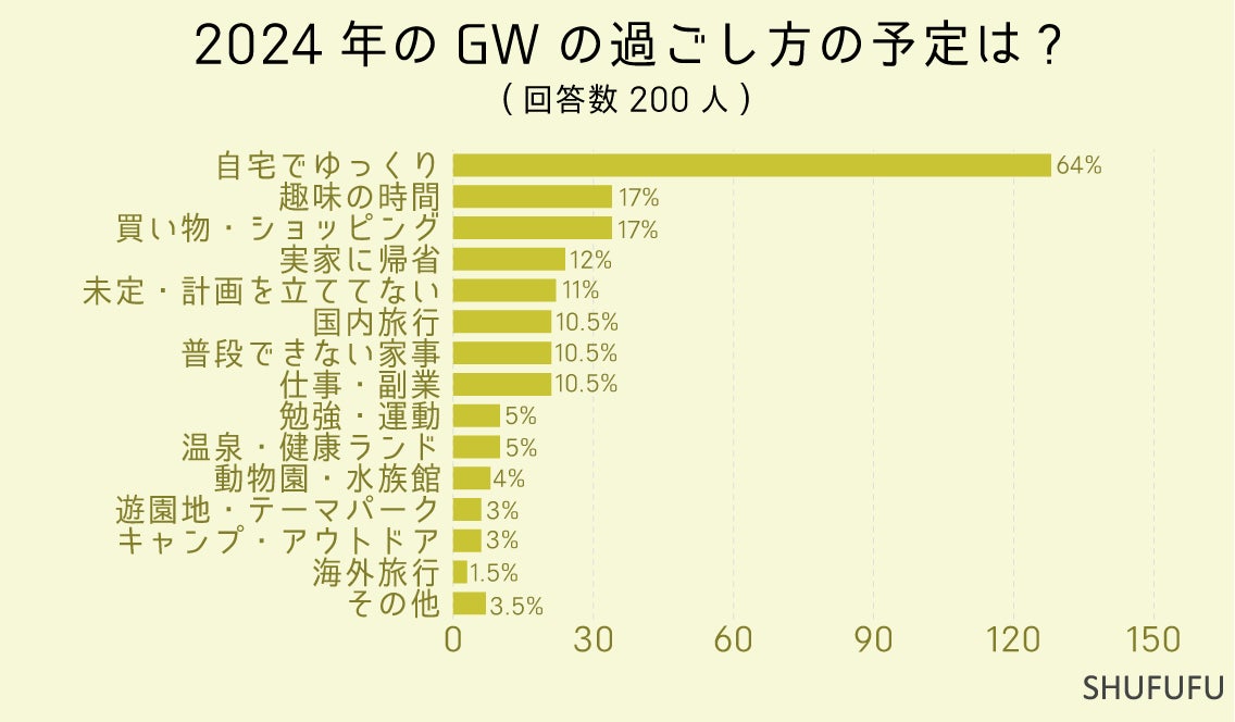 2024年のGWの過ごし方の予定では「自宅でゆっくり」と答える方が1番多かったです。連休はどこも人がいっぱいなので家で過ごしたいという方が多いのでしょうね。