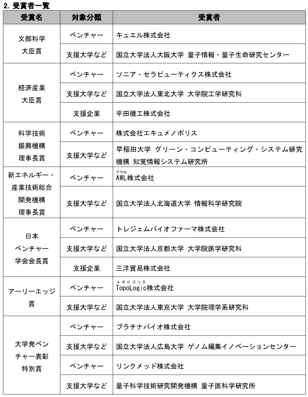 大学発ベンチャー表彰2024 受賞者一覧(JST公式サイト) https://www.jst.go.jp/aas/award.html