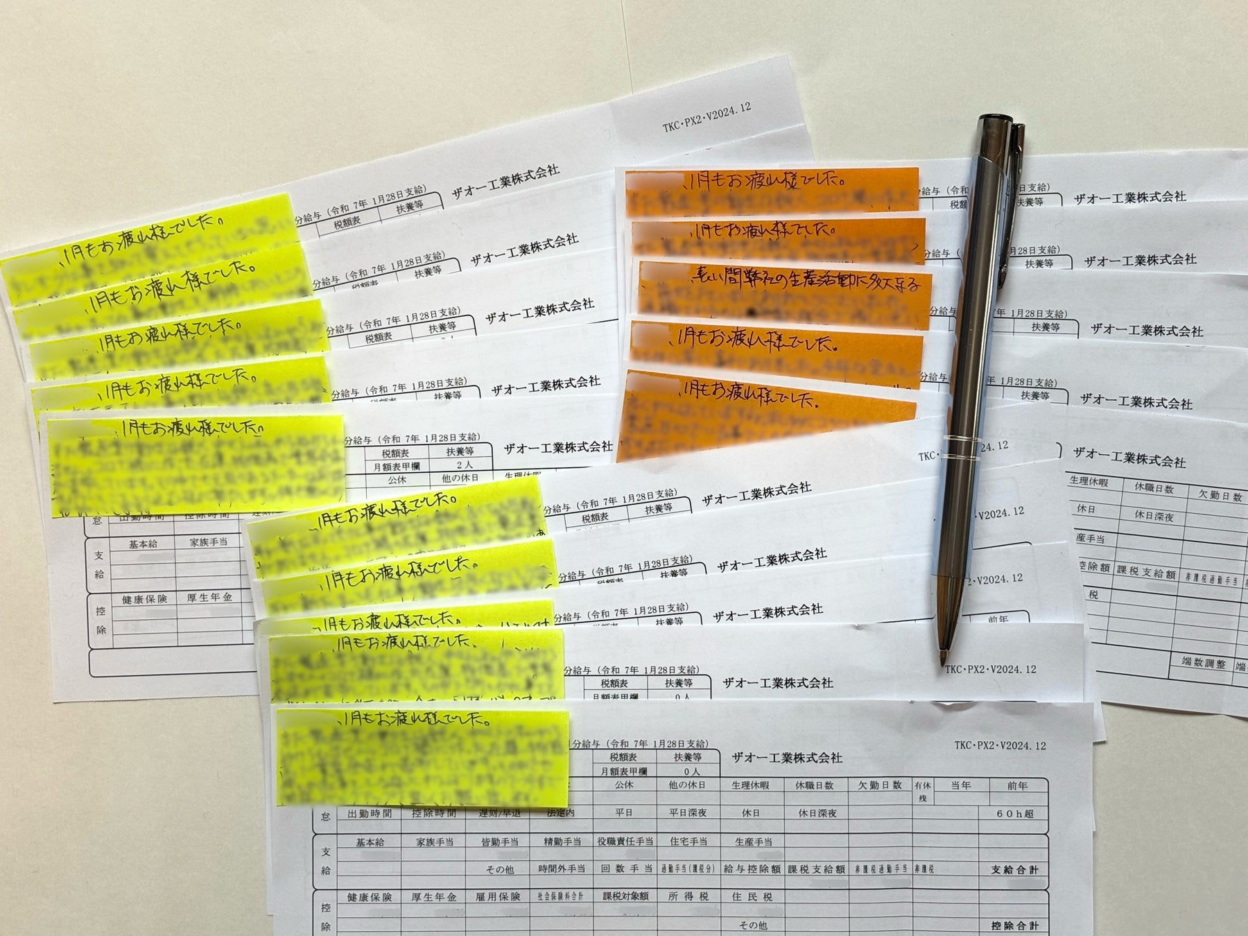 この『やる』と決めたことは、継続するという鈴木さんの姿勢は社内のほかのことでも見られます。そのひとつは、従業員に給料を渡す時、その給料袋にひとり一人に宛てた手書きのメッセージの付箋をつけていることです。