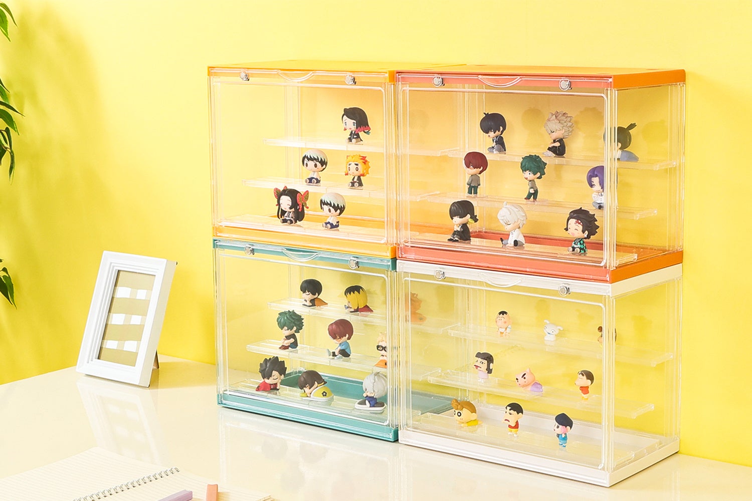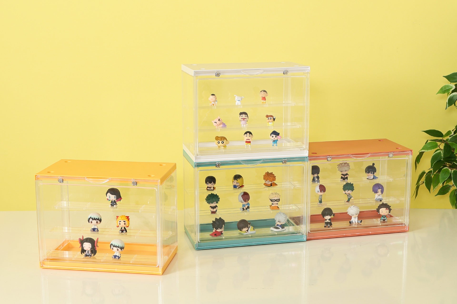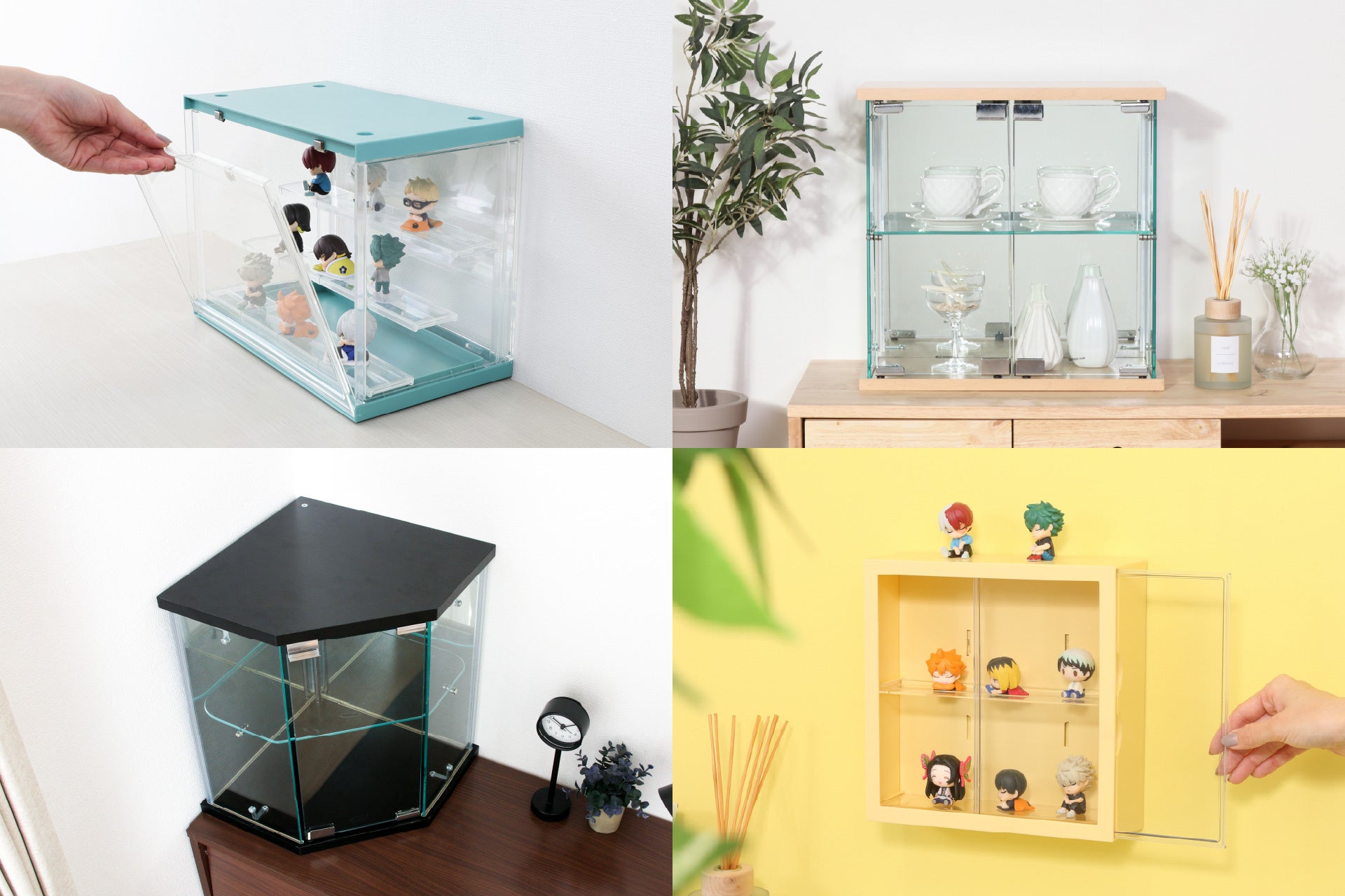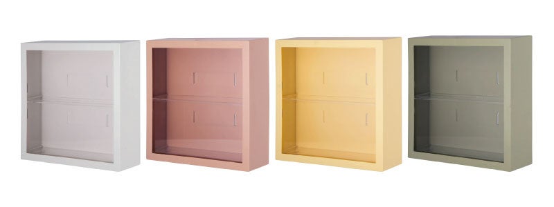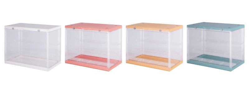 コレクションの邪魔をしないシンプルなデザインを採用しています。ケースに入れることで、バラバラなサイズのコレクション群に視覚的なまとまりを与え、ごちゃつきや統一感のなさを緩和します。特にアクリルタイプはPOPな色合いを採用しており、フィギュアを明るくおしゃれな「見せるインテリア」へと昇華させます。