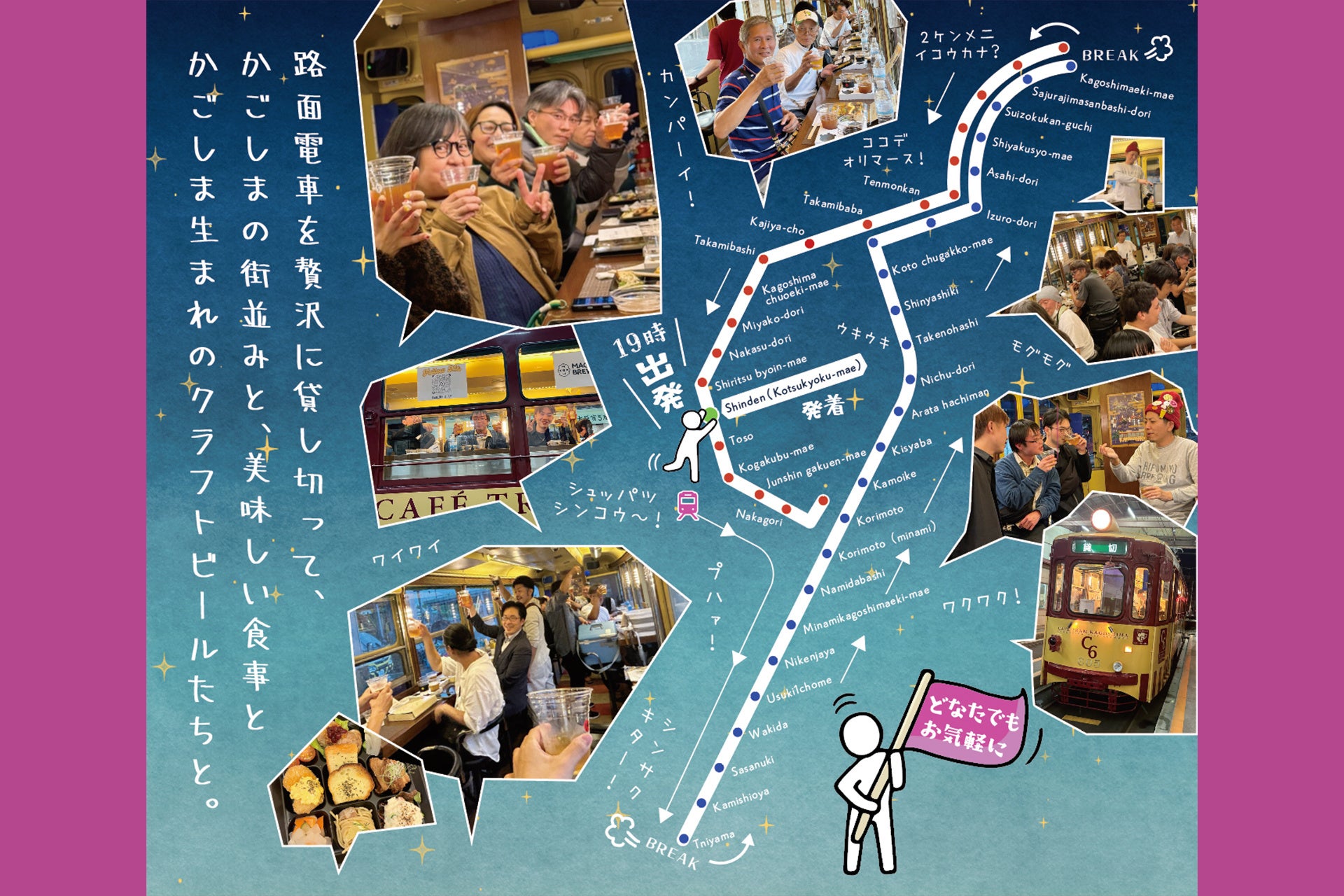 鹿児島の街を走る路面電車を、まるごと貸し切り!美しい街並みを眺めながら、地元のクラフトビールと美味しい料理を楽しむ特別なひととき。鹿児島生まれのこだわりビール4種が飲み放題!